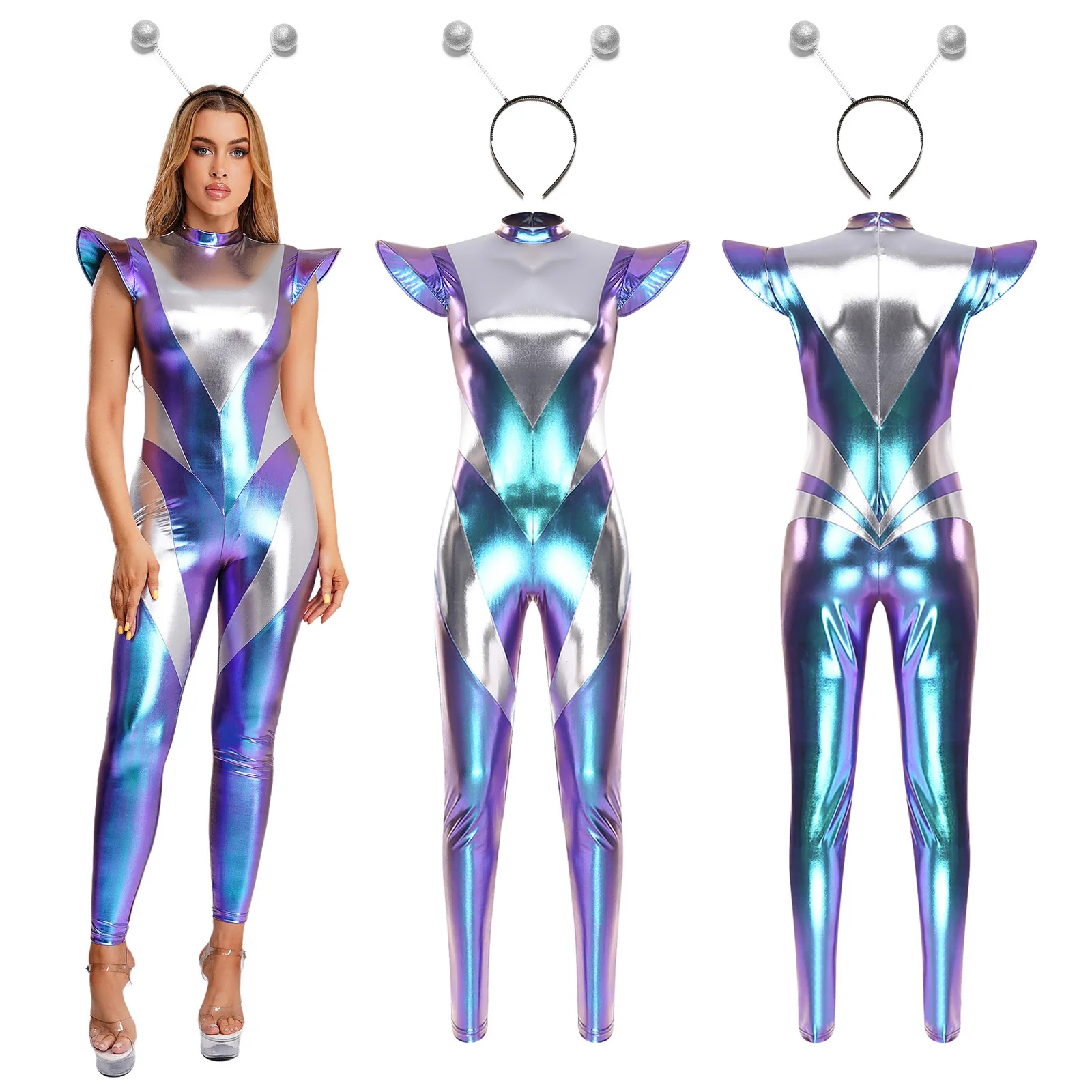 Ženy kosmonaut cizinec halloween cosplais kostým lesklý metalické létat rukáv kamaše kombinéza gumička do vlasů sada pro spaced themed večírek