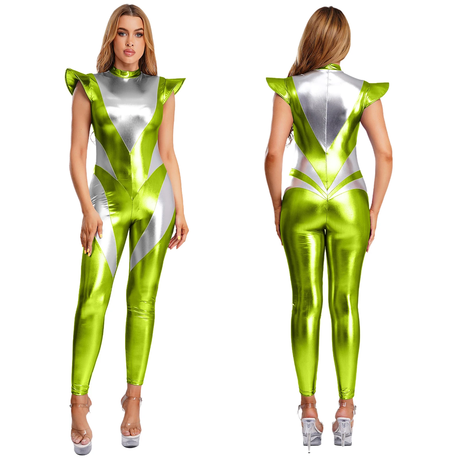 Ženy kosmonaut cizinec vnější mezera cosplais kostým robot unitard kombinéza clubwear barvitý metalické létat rukáv kamaše kalhot