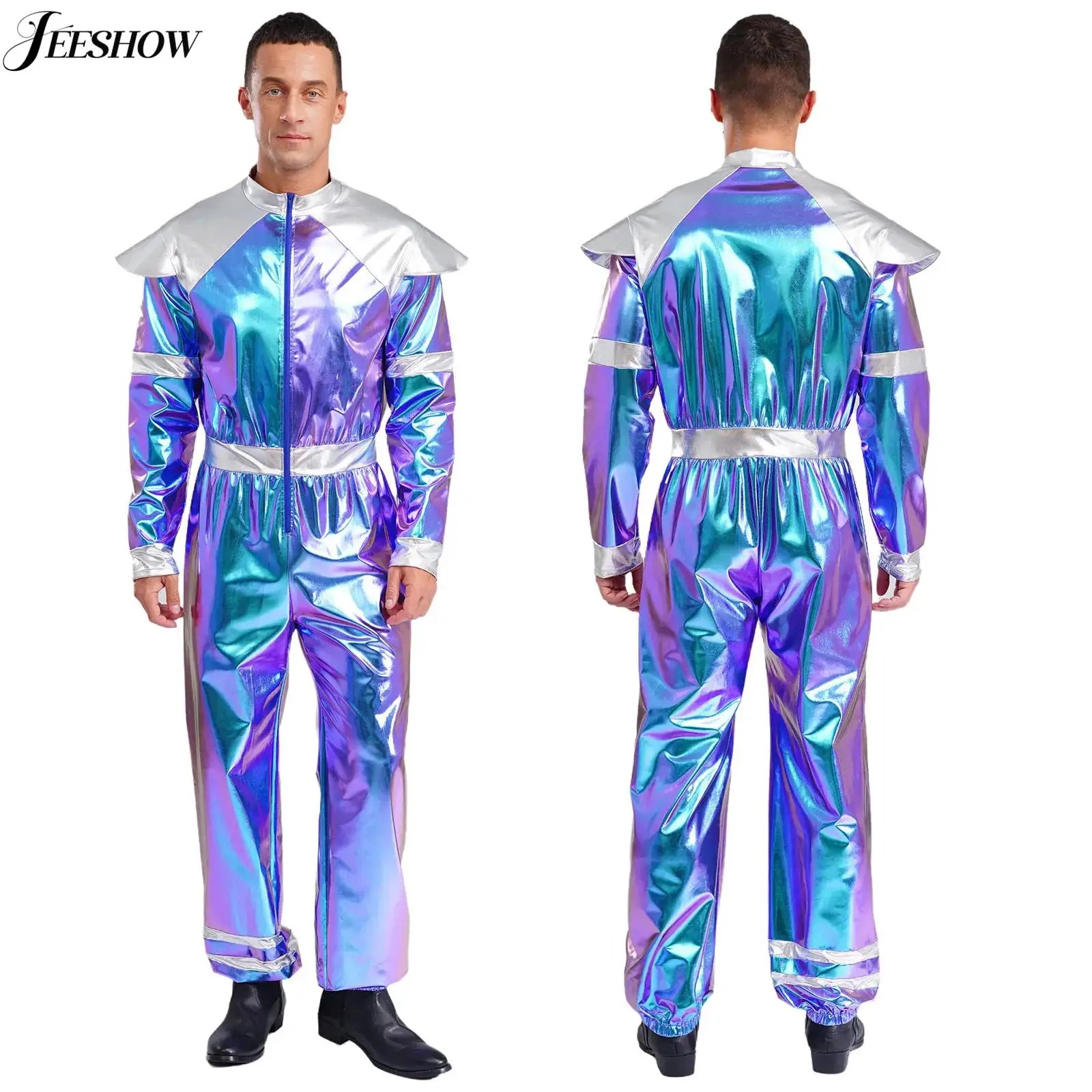 Pánská mezera cizinec kostým halloween bázeň večírek kosmonaut sociální role divadelní hra bájit šaty barva blok lesklý metalické dlouhé rukáv kombinéza