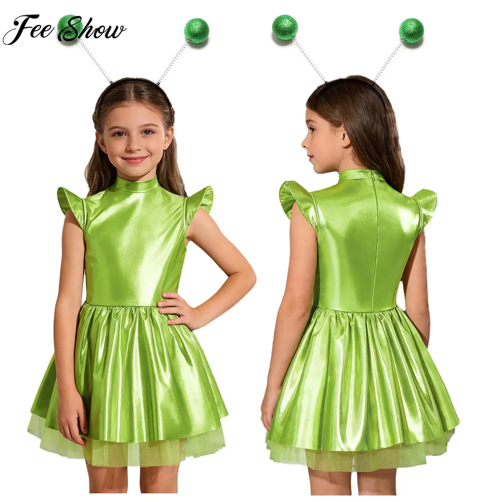 Děti dívčí halloween cizinec cosplais šaty s extraterrestre vlasy obruč metalické lesklý vnější mezera galaxy bojovnice robot kostým