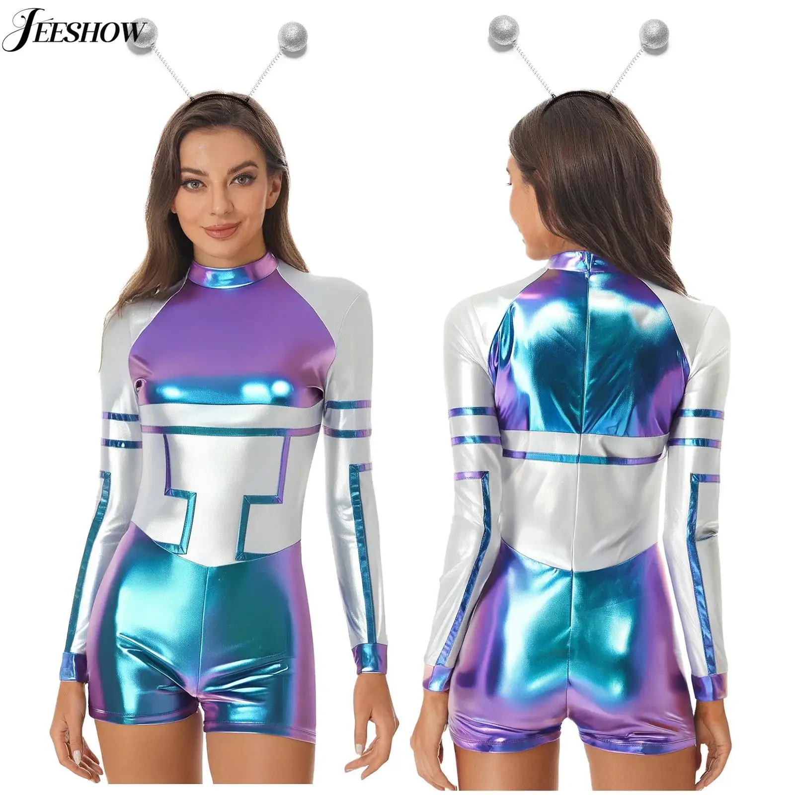 Ženy mezera cizinec kostým barva blok metalické dlouhé rukáv kombinéza s headwear kosmonaut bájit šaty pro mezera bázeň večírek