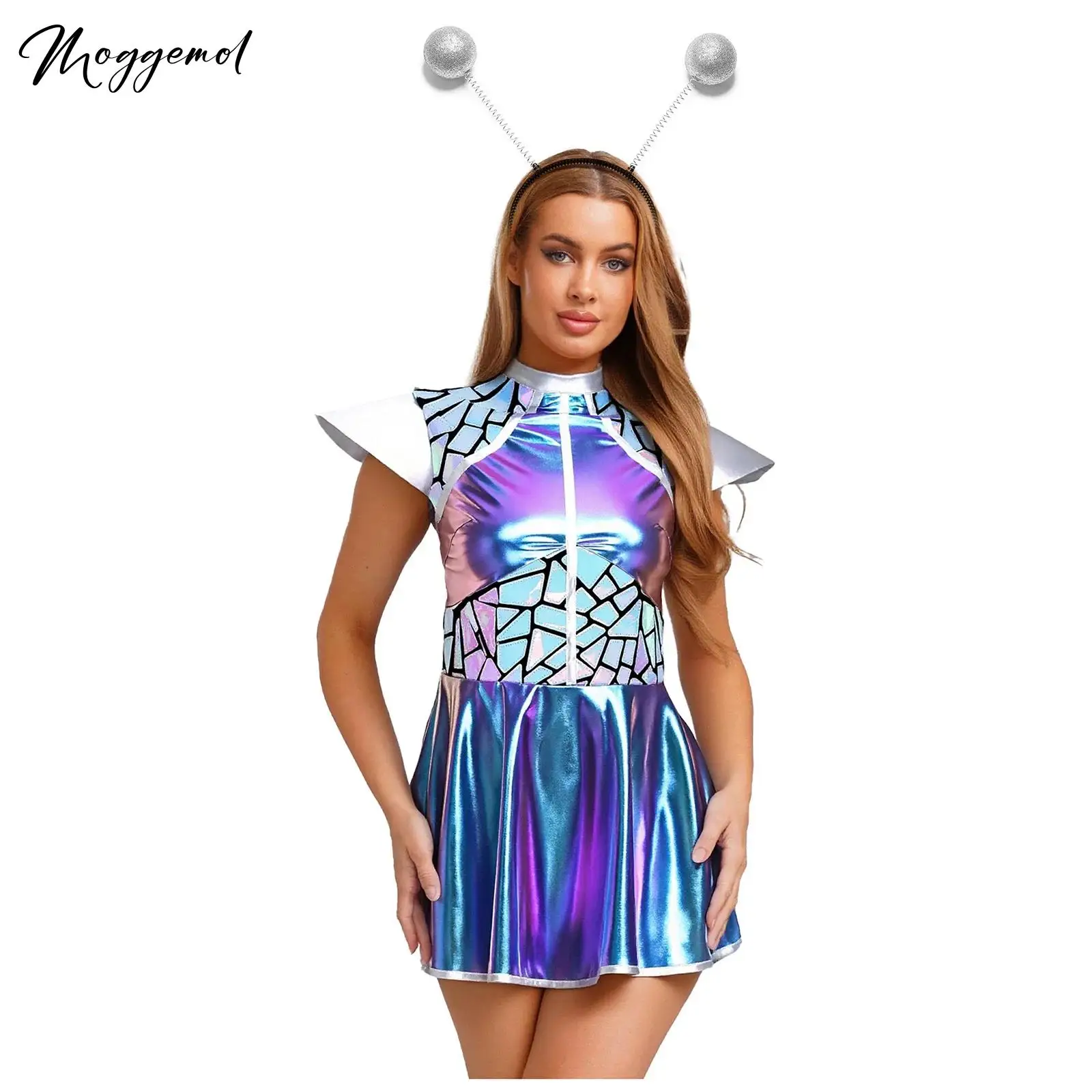 Ženy cizinec kosmonaut cosplais kostým outerspace čepice rukáv metalické lesklý a-line šaty s cizinec vlasy obruč robot budoucnost svět