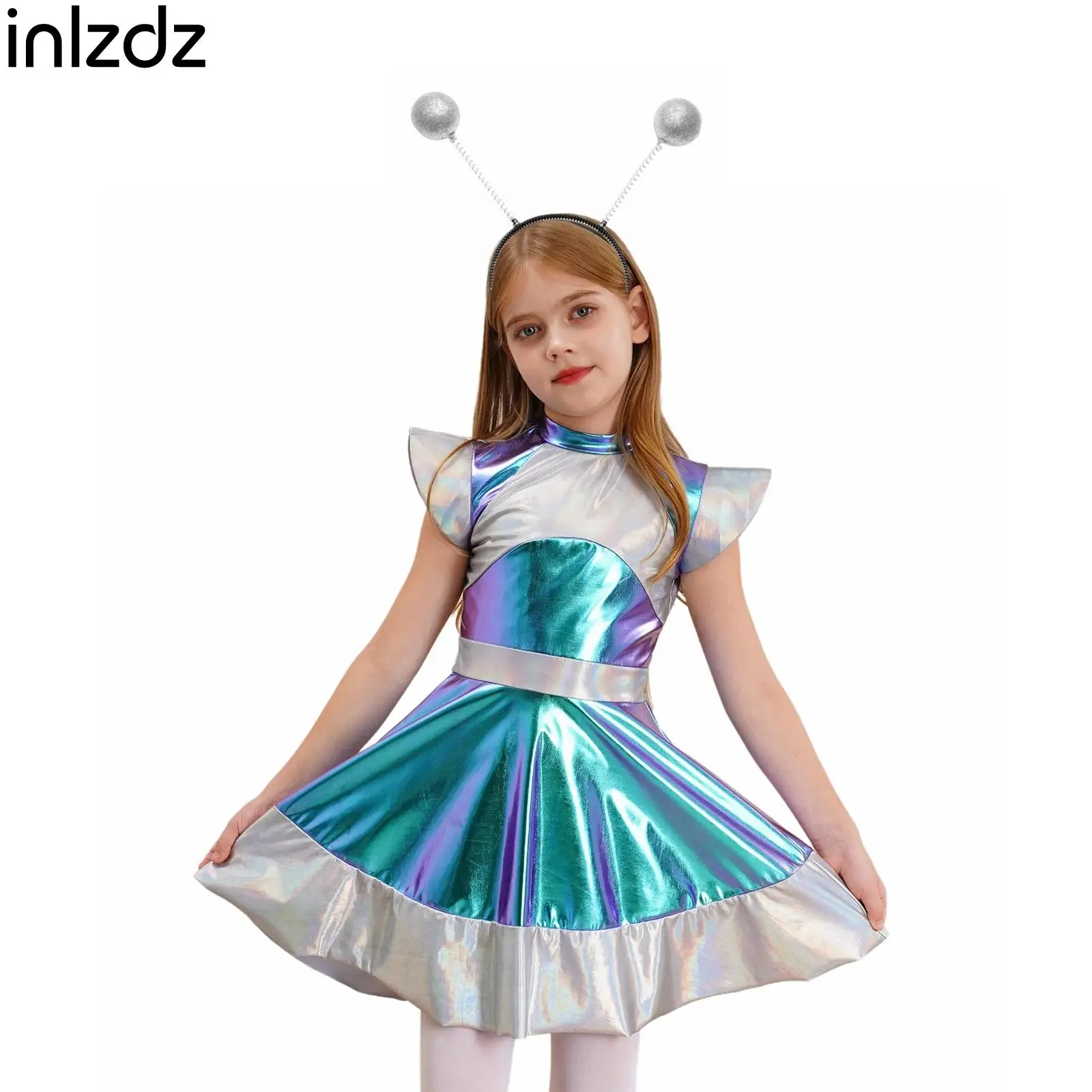 Děti dívčí halloween vnější mezera cutie cizinec cosplais kostým čepice rukáv metalické lesklý šaty s vlasy obruč pro škola ukázat