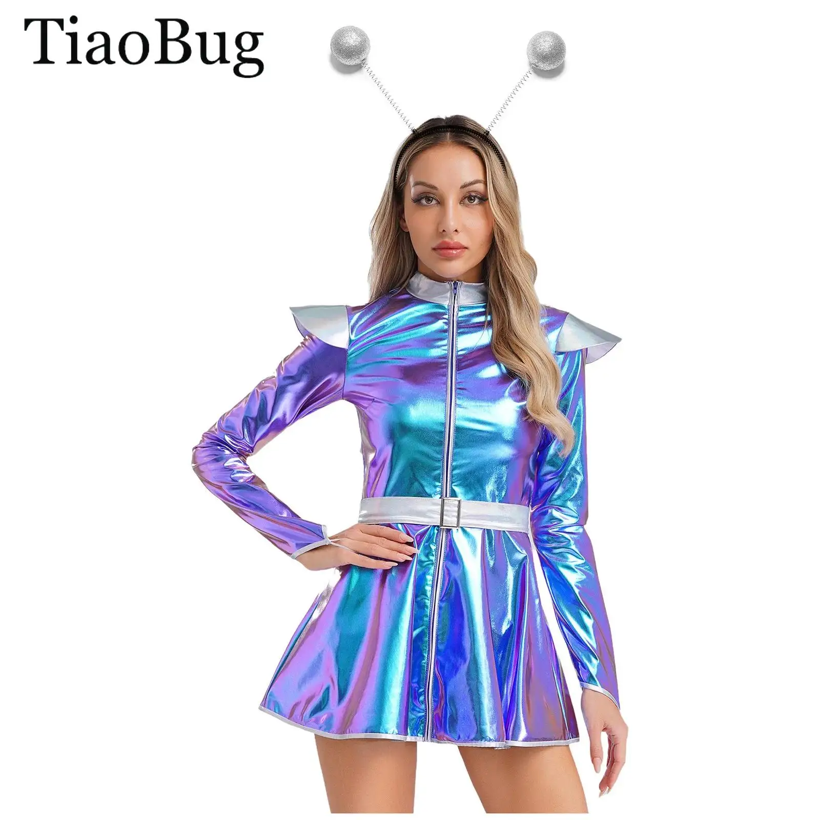 Ženy cizinec kosmonaut cosplais kostým dlouhé rukáv na zip metalické lesklý a-line šaty a vlasy obruč halloween mezera themed večírek