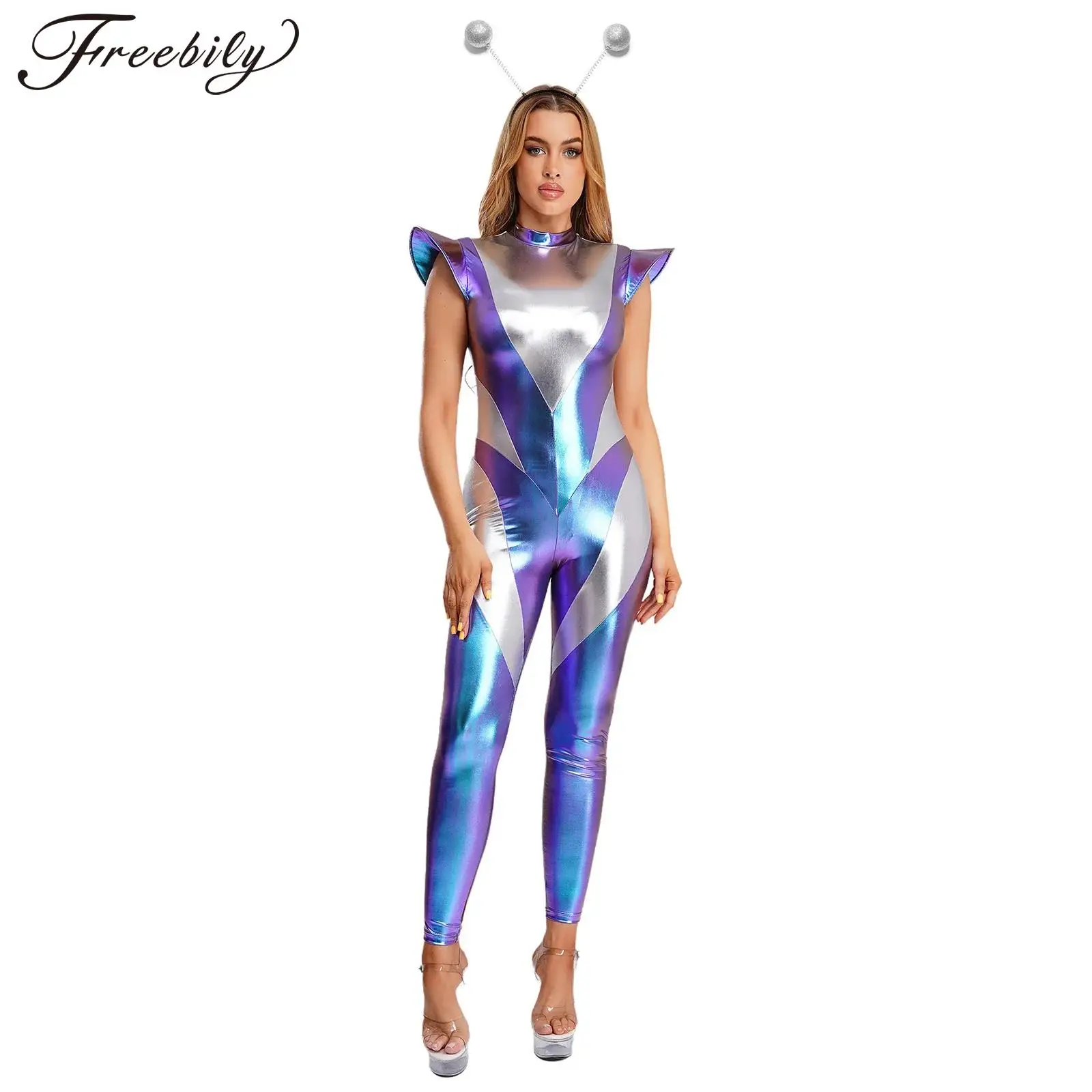 Ženy cizinec kosmonaut sociální role divadelní hra kombinéza lesklý vysoký krájet moderní kočičí oblek s ruka rukávy a vlasy obruč čelenka sada