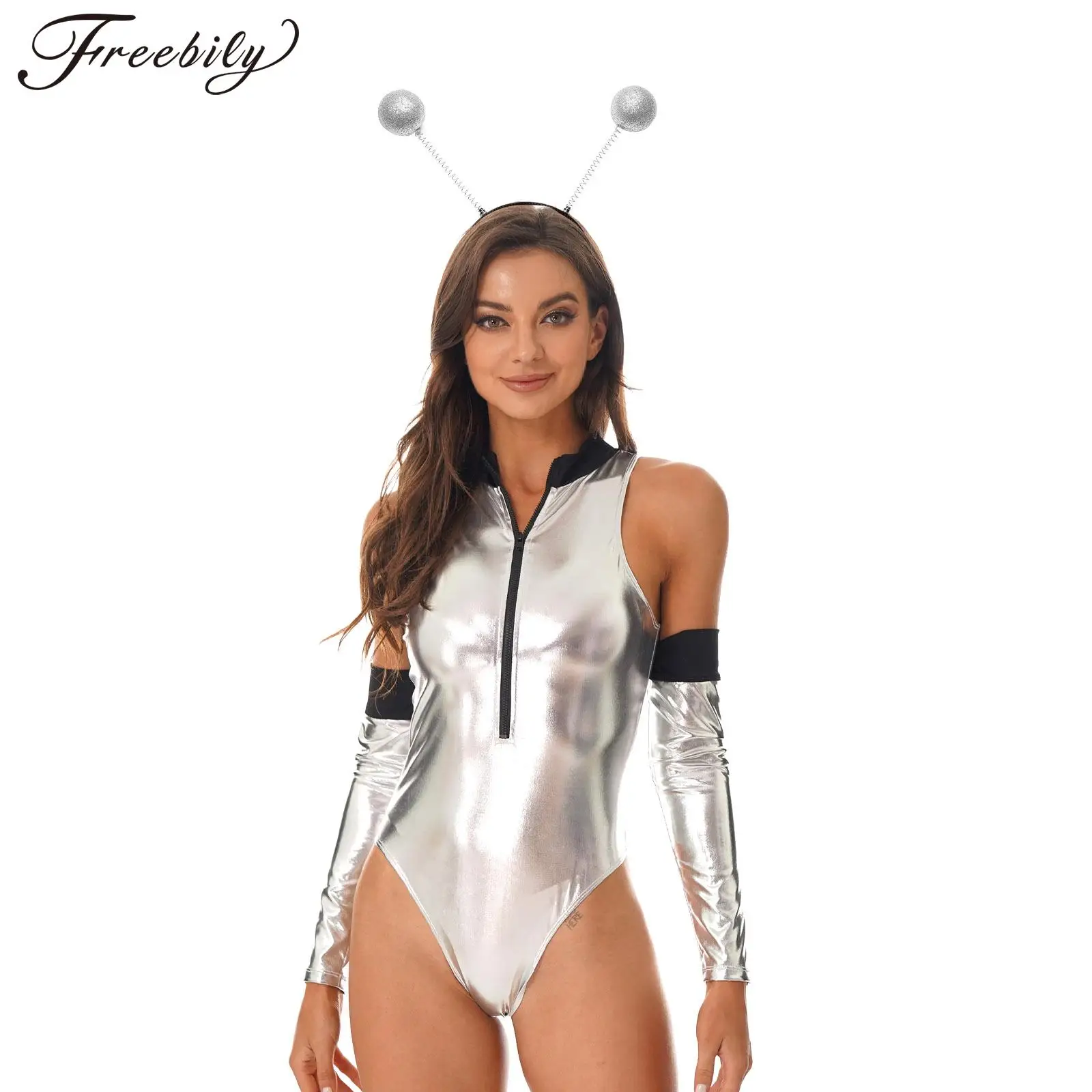 Ženy cizinec kosmonaut sociální role divadelní hra kombinéza lesklý vysoký krájet moderní kočičí oblek s ruka rukávy a vlasy obruč čelenka sada