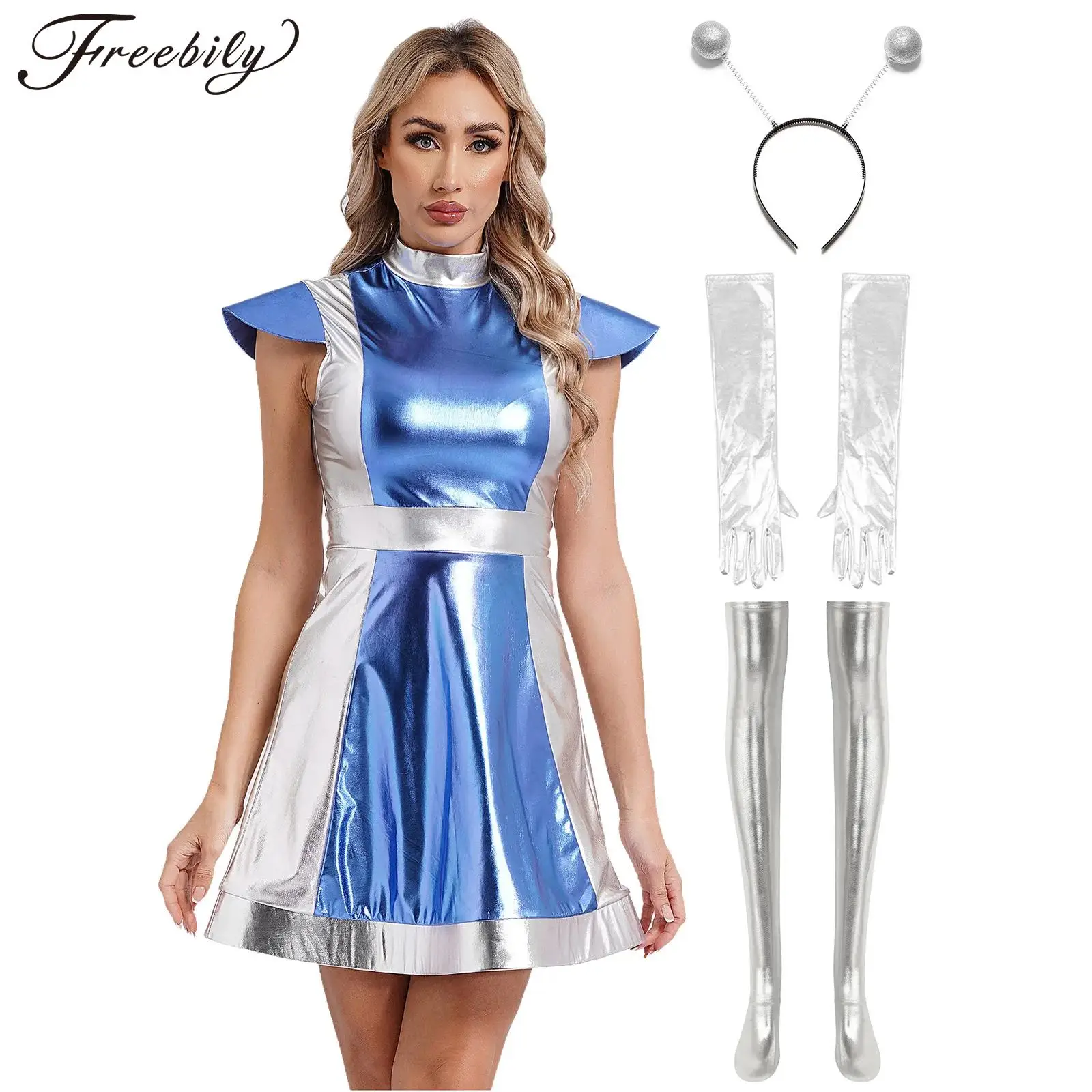 Ženy vnější mezera bitevník cizinec dress-up šaty vlasy obruč dlouhé rukavice + punčošky metalické lesklý kosmonaut cosplais kostým