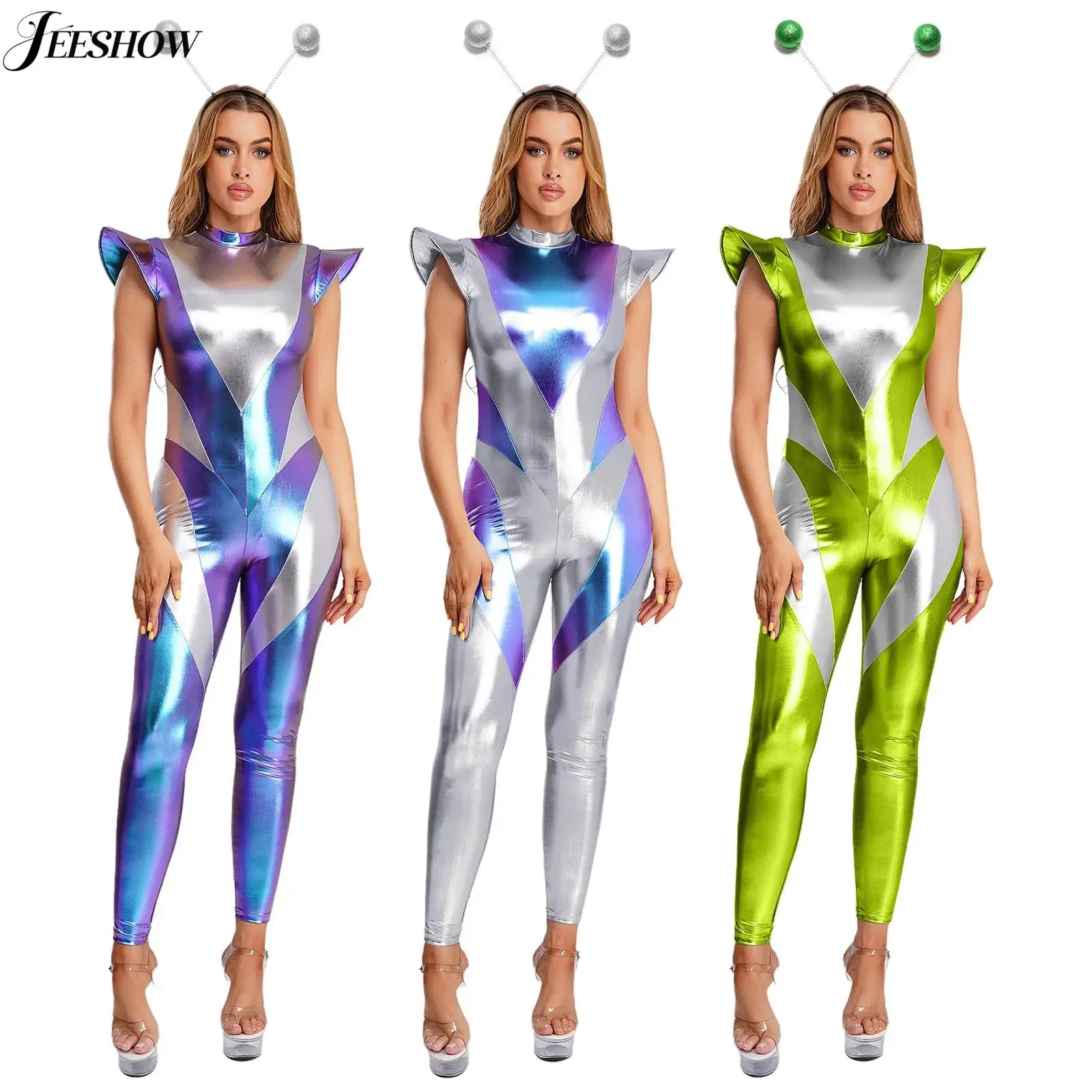 Halloween futuristic cizinec kombinéza kostým pro ženy s metalické lesklý barva blok cizinec cosplais šaty a headwear sada
