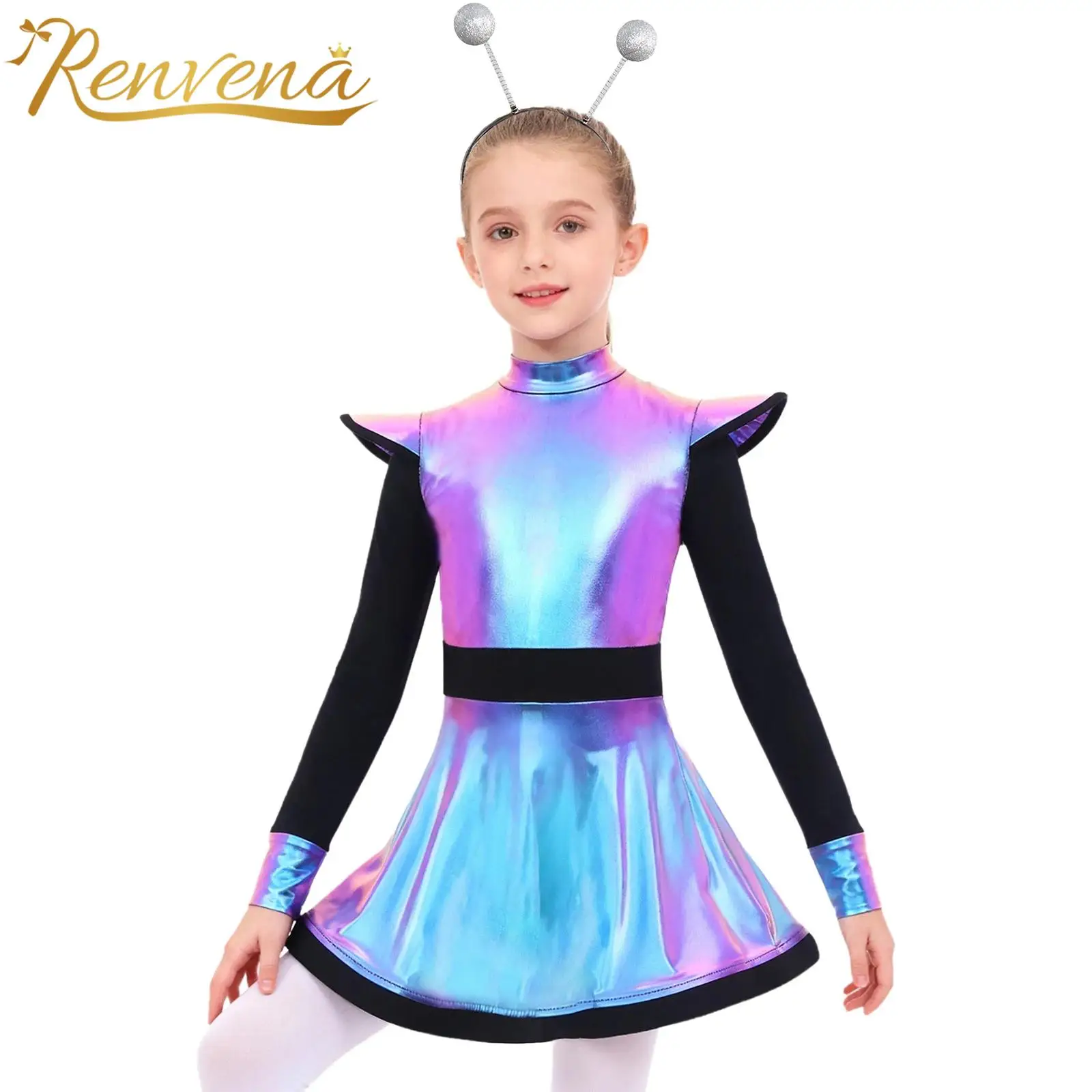Děti dívčí halloween vnější mezera cutie cizinec cosplais kostým čepice rukáv metalické lesklý šaty s vlasy obruč pro škola ukázat