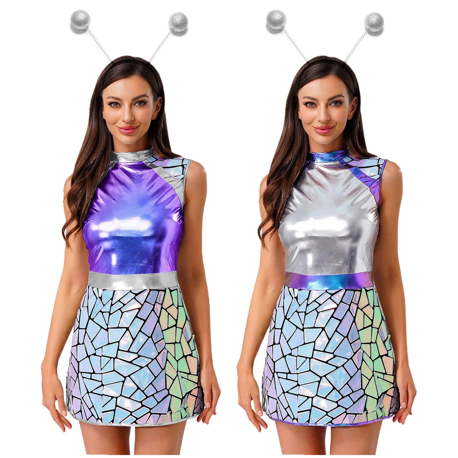 Ženy cizinec kosmonaut mezera robot galaxy bojovnice cosplais kostým metalické lesklý flitr šaty s headwear pro halloween večírek