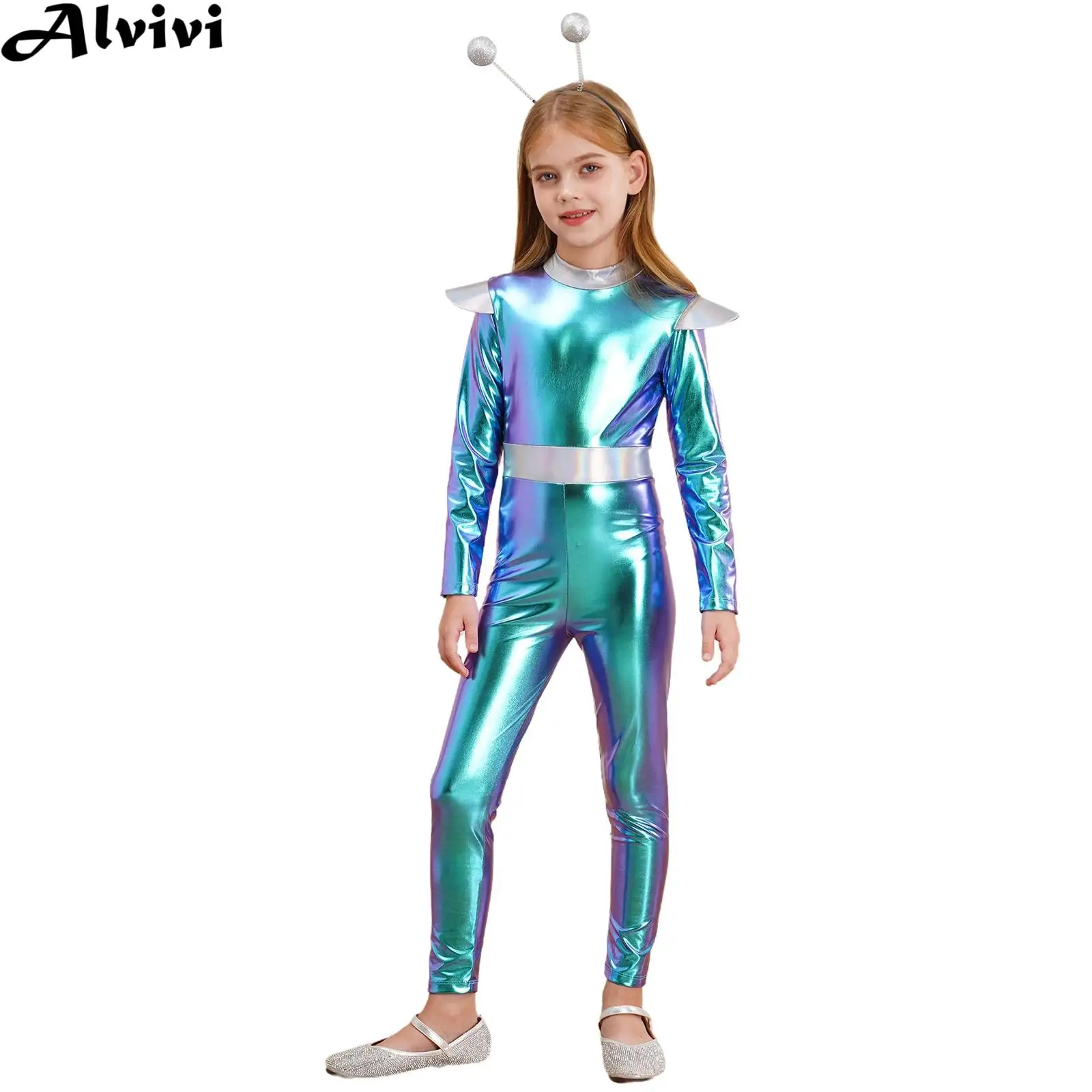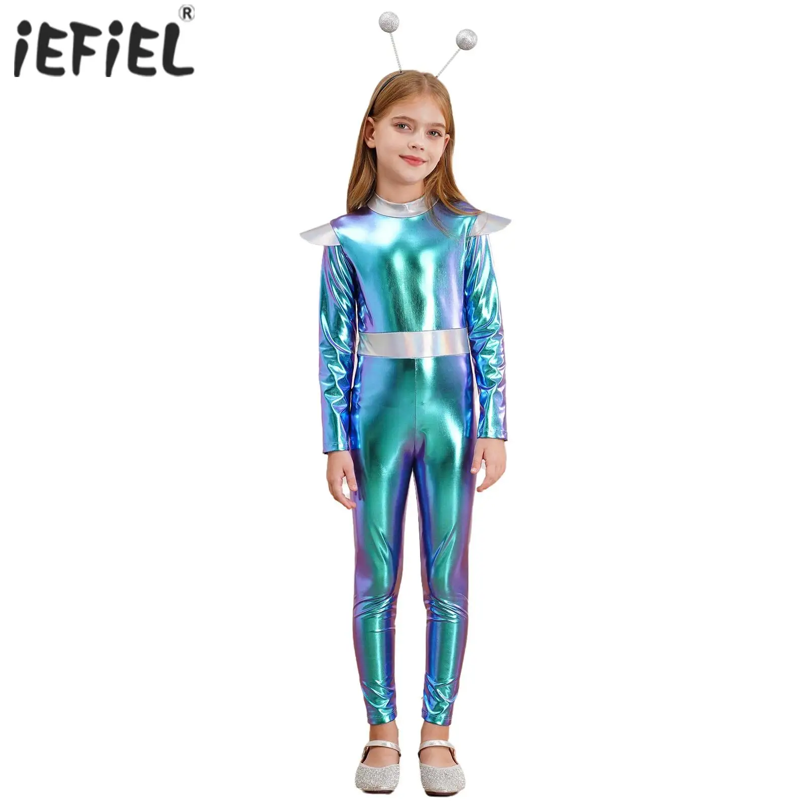 Děti dlouhé rukáv metalické lesklý kombinéza s vlasy obruč halloween karneval bázeň večírek vnější mezera cutie cizinec cosplais kostým