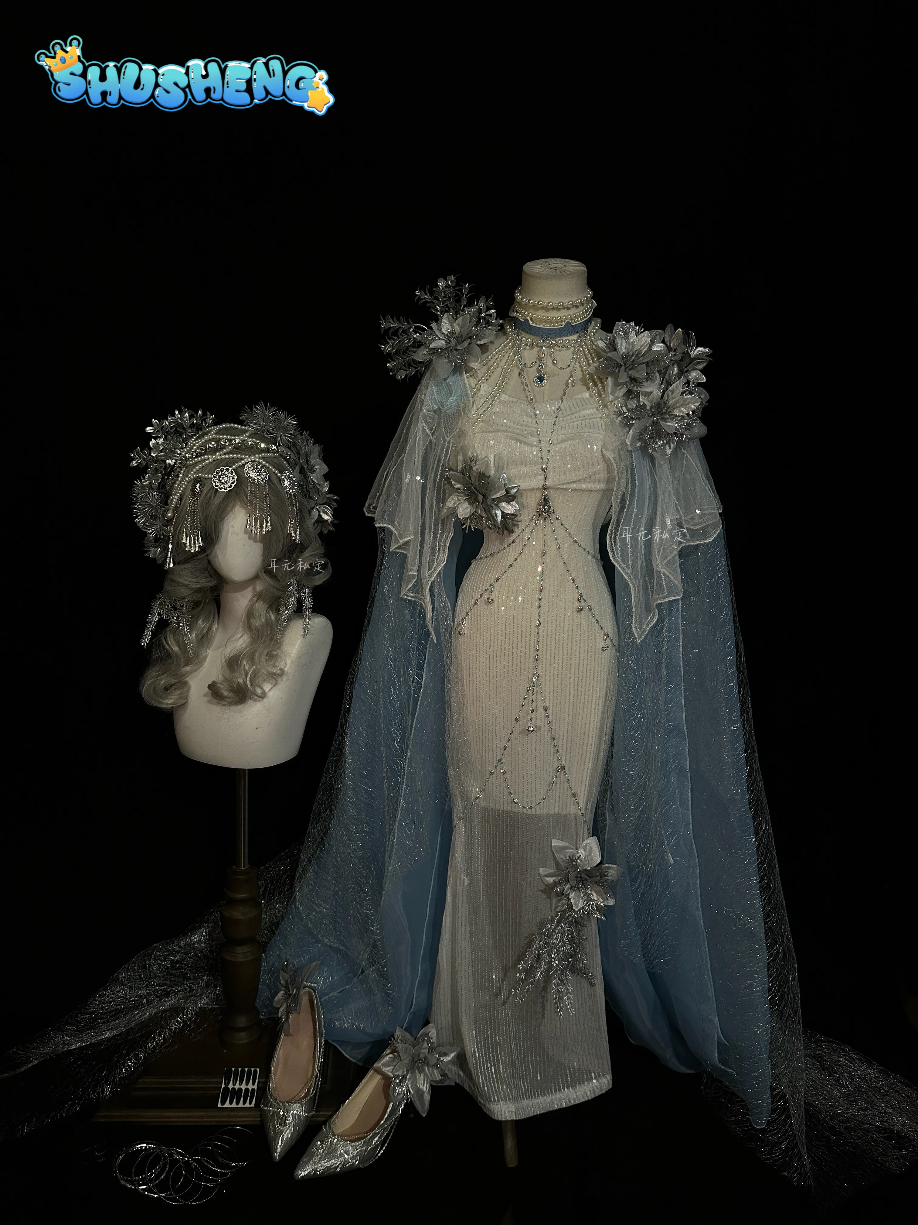 Identita V krvavý královna maria cosplais kostým bílá kožich přehoz šaty bledule příslušenství paruka led sněžit slavnost představení kostým