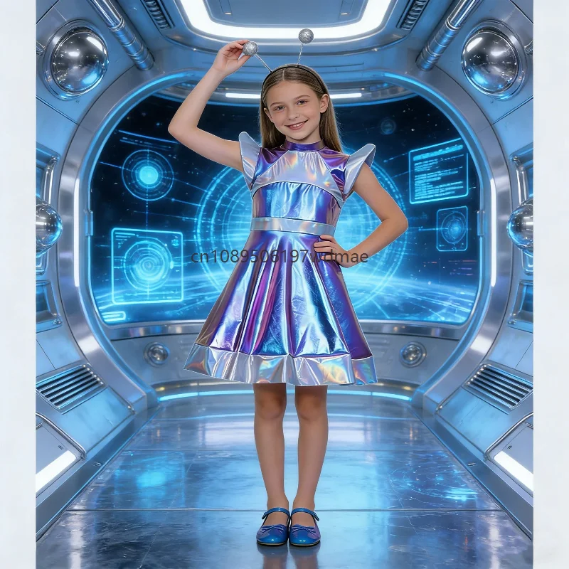 Děti dívčí halloween vnější mezera cutie cizinec cosplais kostým čepice rukáv metalické lesklý šaty s vlasy obruč pro škola ukázat