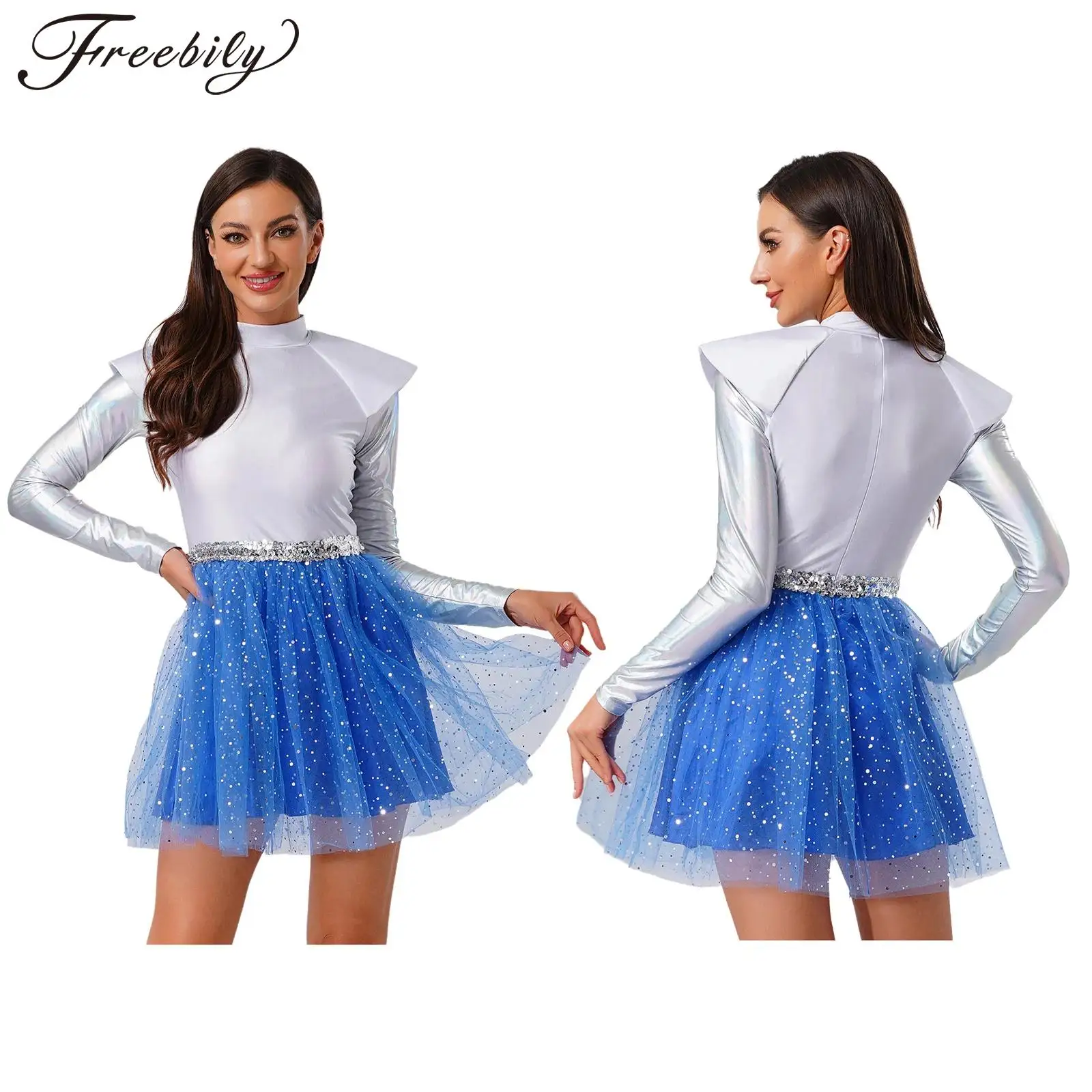 Ženy halloween bázeň večírek cizinec kosmonaut mezera bojovnice cosplais kostým metalické lesklý dlouhé rukáv flitr tyl tutu šaty