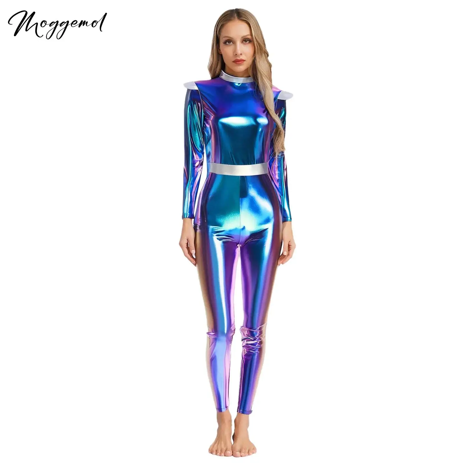 Ženy lesklý metalické cizinec kostým dlouhé rukávy bojovnice kosmonaut cosplais kombinéza vnější mezera robot kostým pro halloween večírek