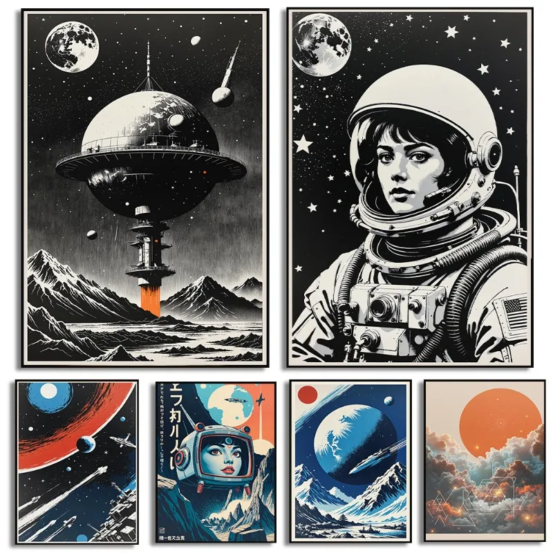 Vintage futuristic ženské kosmonaut mezera nádraží zeď umění plakát raketa spustit mezera umění cizinec galaxy exploration domácí dekorace