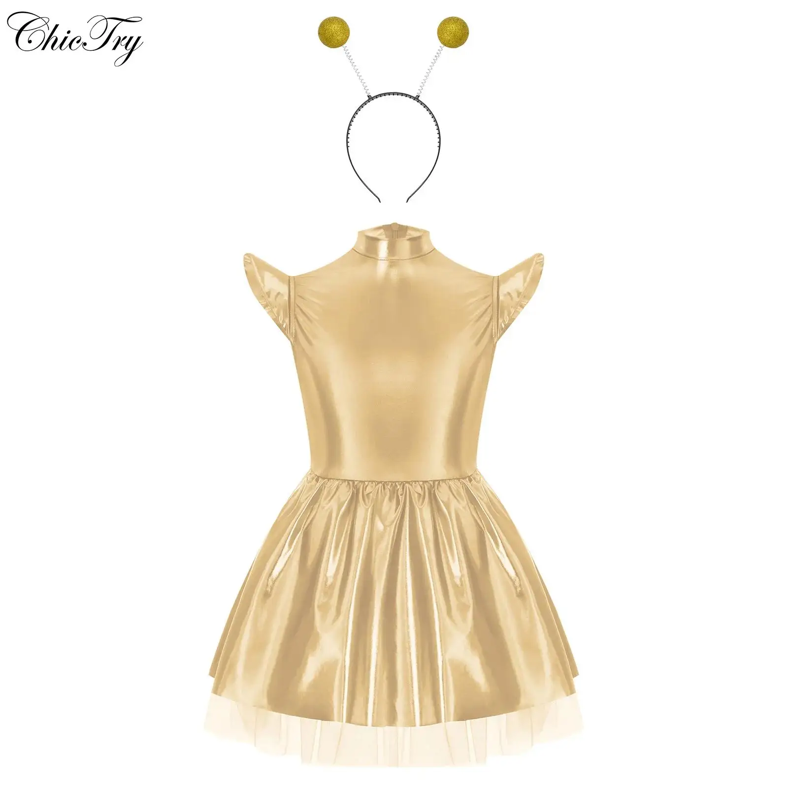 3ks dívčí cizinec kostým lesklý metalické osvěta nejvyšší s sukně vlasy obruč mezera muž kosmonaut robot cosplais halloween večírek šaty nahoře