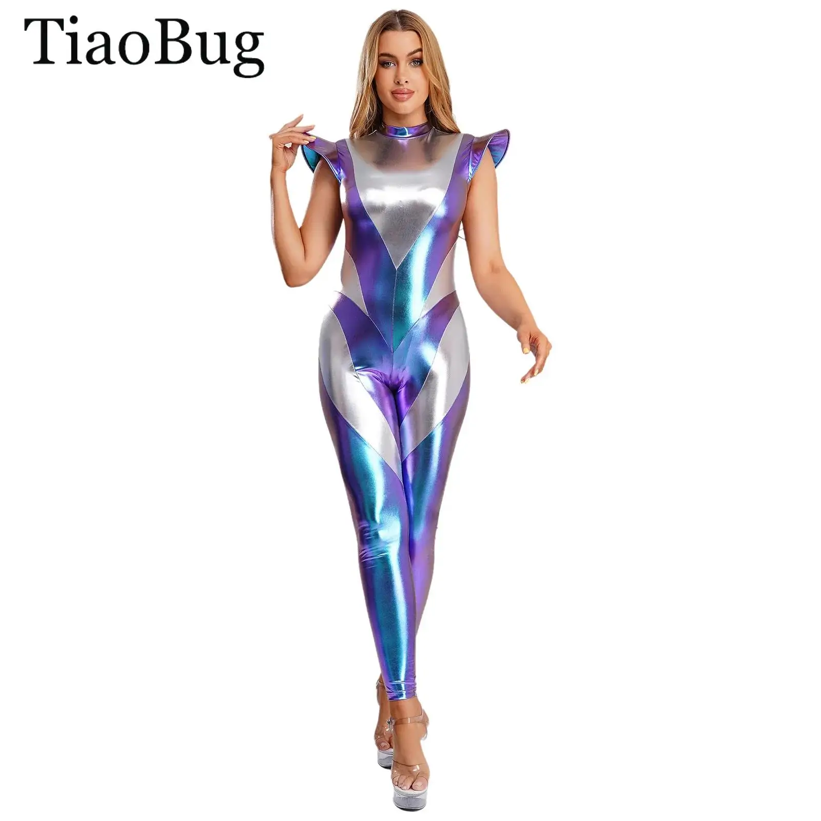Ženy cizinec robot cosplais kostým metalické lesklý outerspace kosmonaut plný kombinéza kombinéza s vlasy obruč halloween roleplay