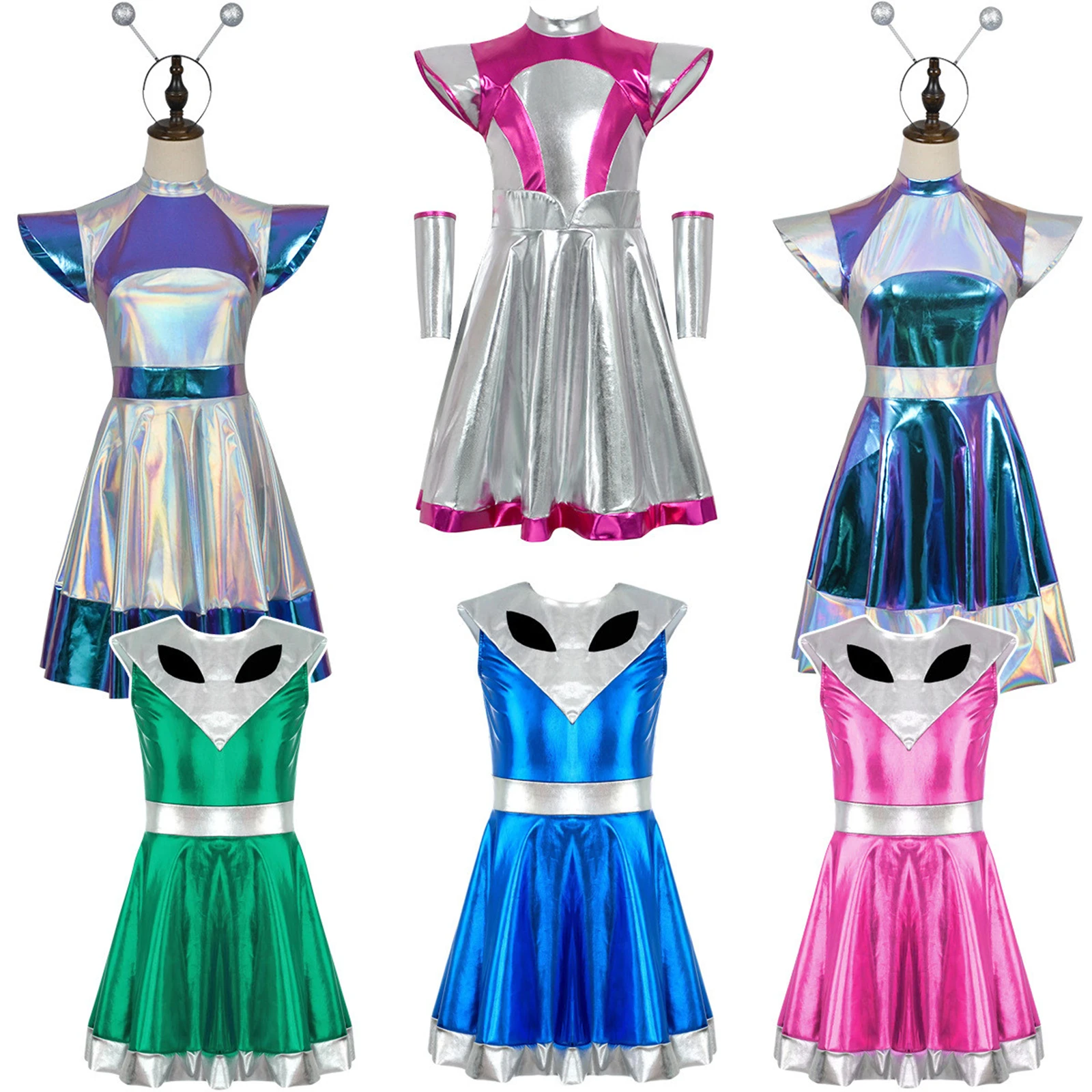 Ženy děti cizinec vlasy obruč vnější mezera legrační cizinec outerspace cosplais kostým themed večírek roleplay kostým karneval šaty nahoře