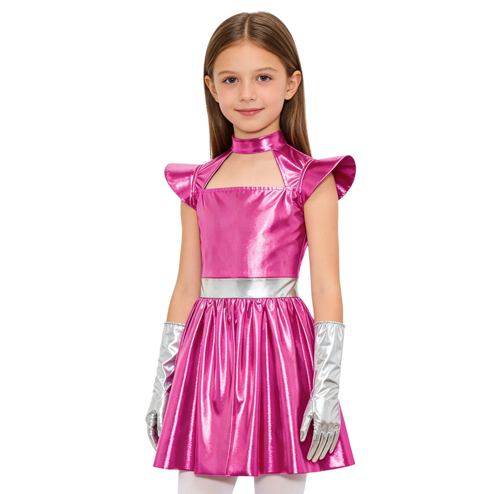 Děti dívčí mezera cizinec robot kosmonaut galaxy bojovnice cosplais kostým metalické lesklý šaty s rukavice pro halloween bázeň večírek