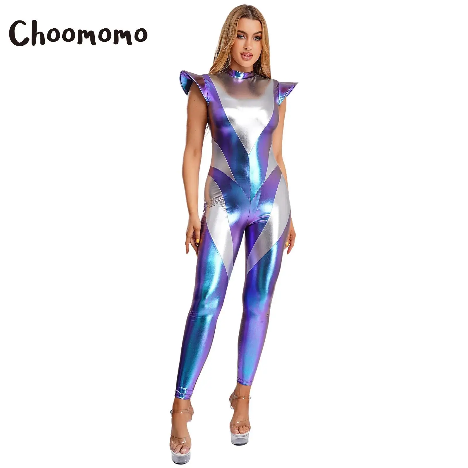 Ženy cizinec kosmonaut cosplais unitard s vlasy obruč metalické lesklý robot outerspace plný kombinéza kombinéza halloween šaty nahoře