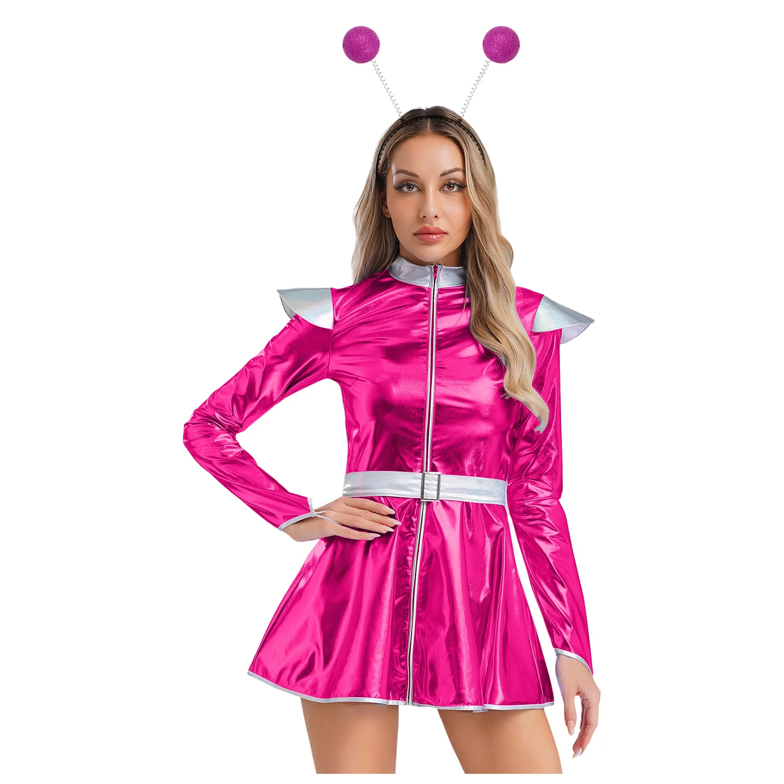 Ženy móda cizinec kosmonaut cosplais šaty s vlasy obruč dlouhé rukáv lesklý a-line šaty pro halloween mezera themed večírek