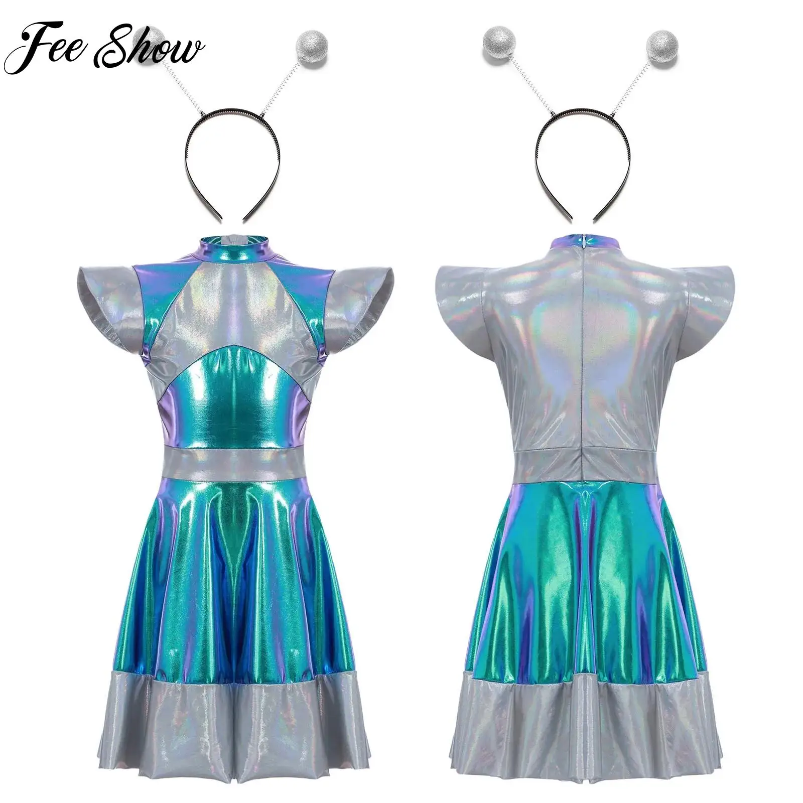 Ženy děti cizinec vlasy obruč vnější mezera legrační cizinec outerspace cosplais kostým themed večírek roleplay kostým karneval šaty nahoře