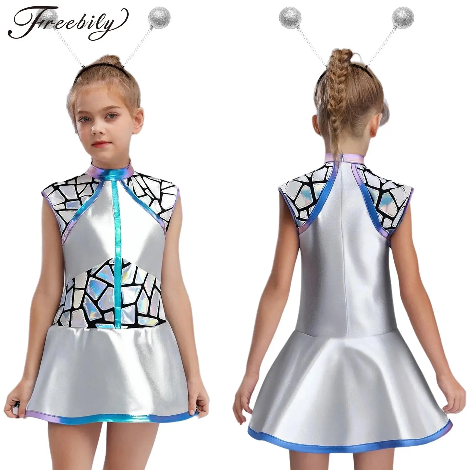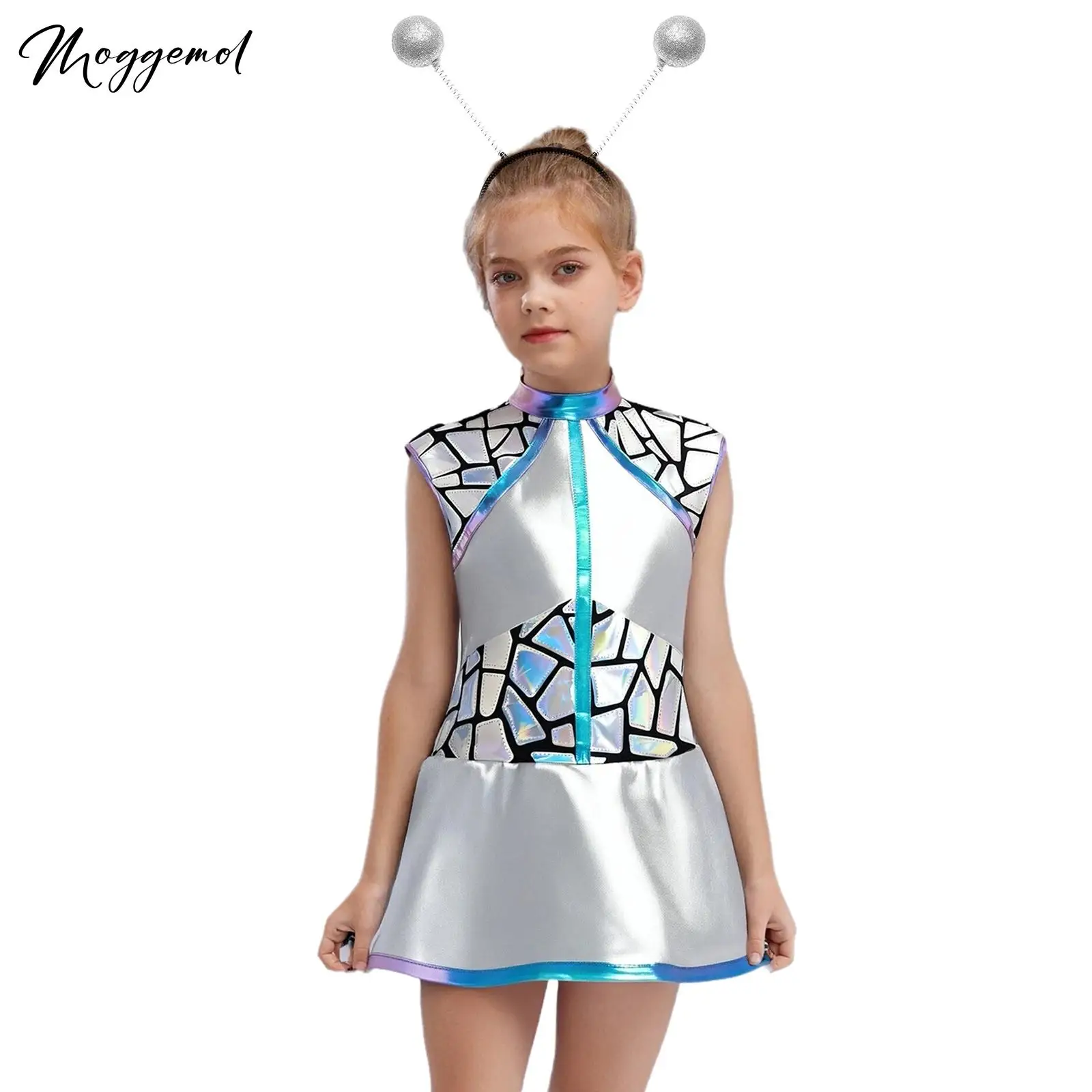 Dívčí 2ks cizinec kostýmy lesklý metalické bez rukávů vnější mezera flitry šaty s anténami glittery koule vlasy obruč čelenka