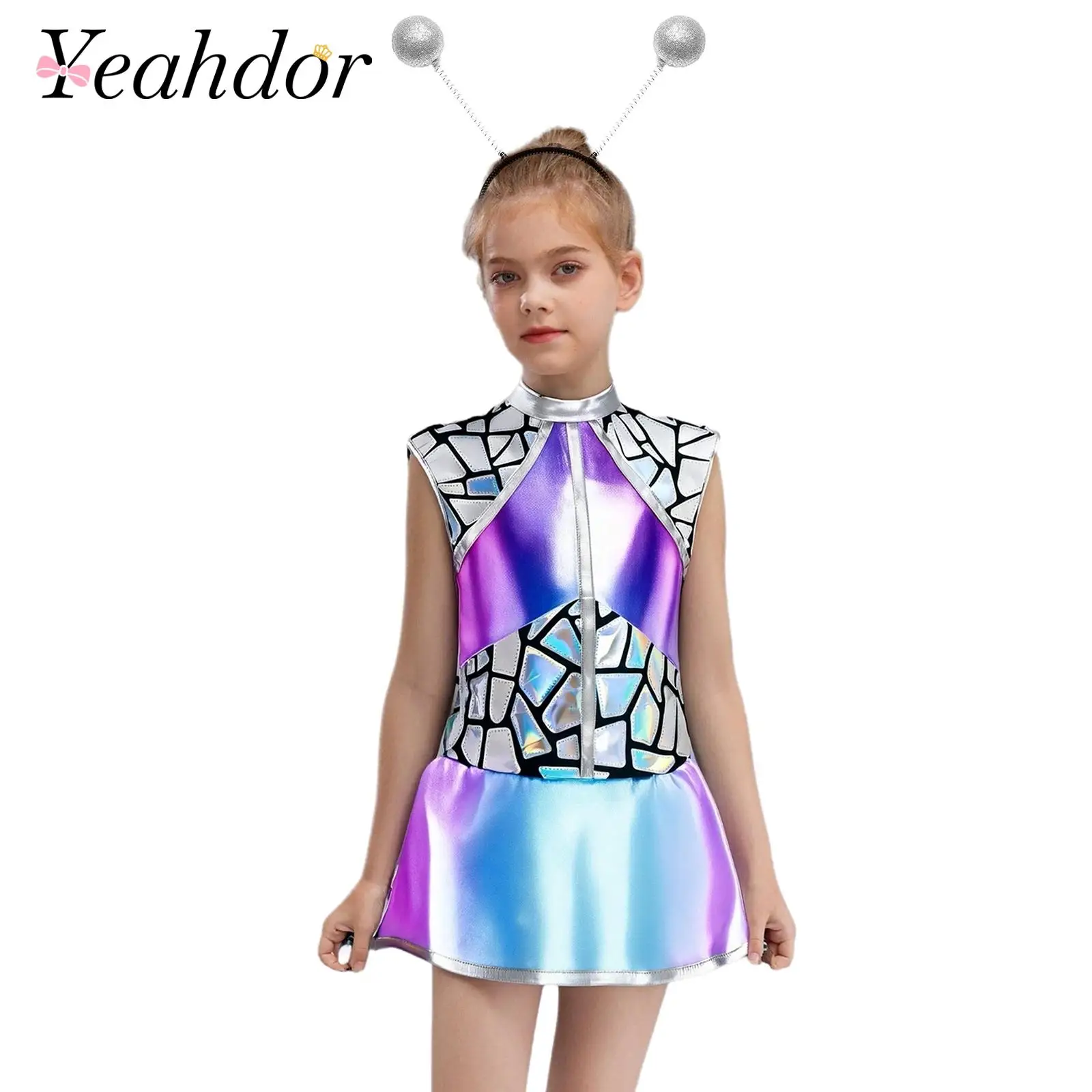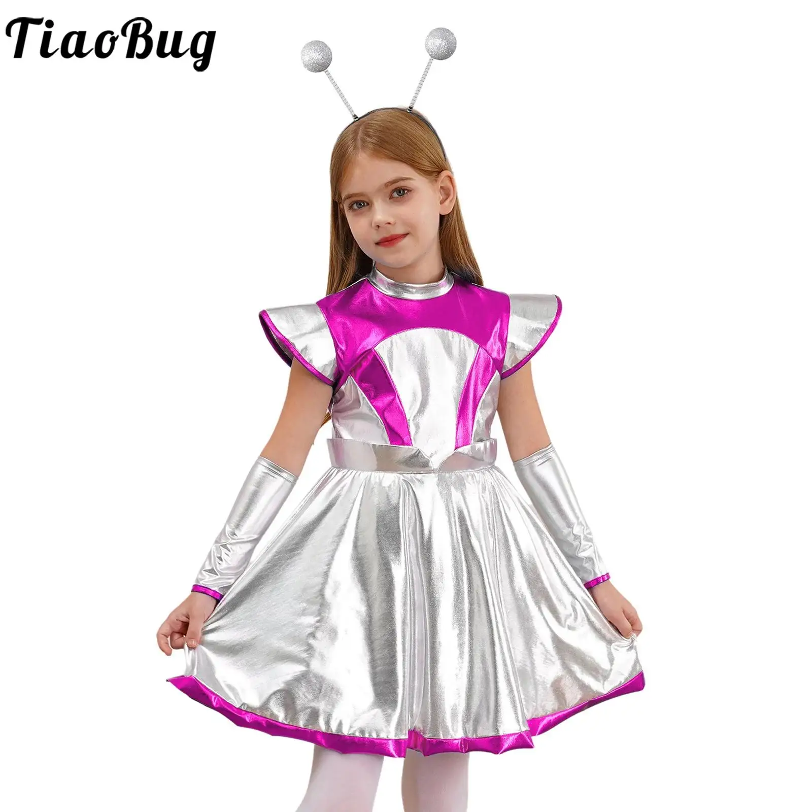 Děti dívčí halloween vnější mezera cutie cizinec cosplais kostým čepice rukáv metalické lesklý šaty s vlasy obruč pro škola ukázat