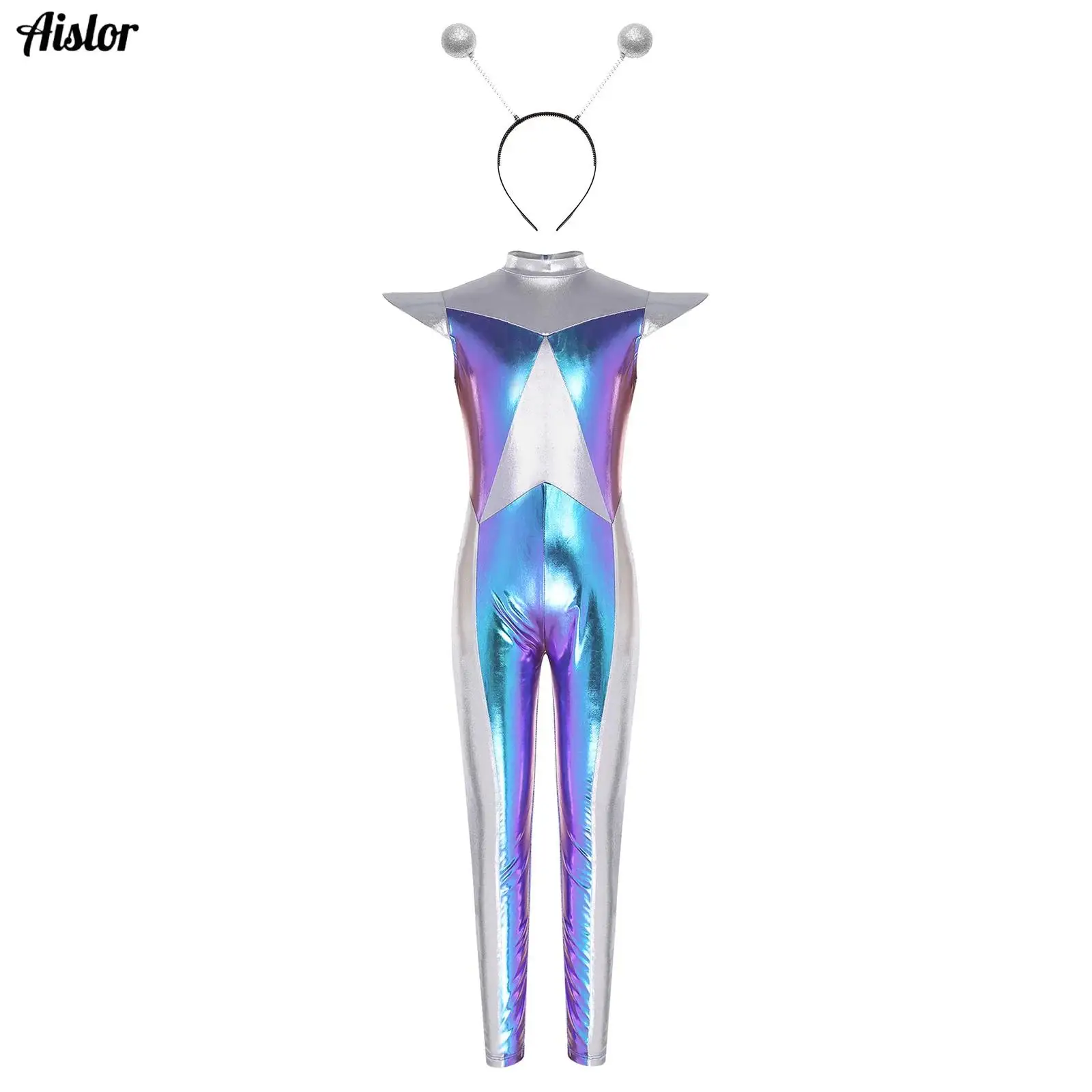 Děti dívčí cizinec kostým sada barva blok metalické kombinéza vlasy obruč pro halloween role-playing cosplais bázeň večírek bájit záruka