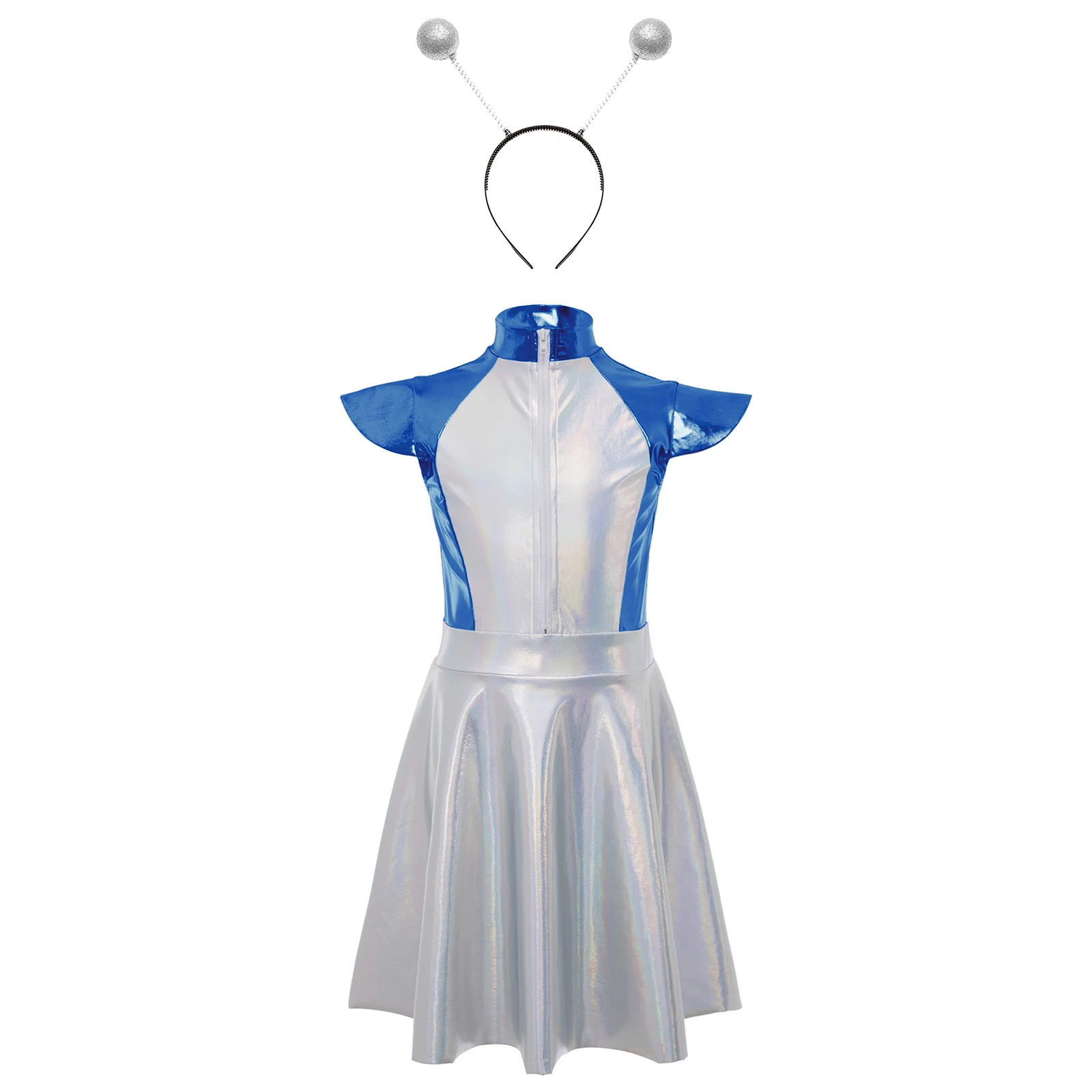 Dívčí halloween cizinec outerspace kosmonaut kostým lesklý metalické čepice rukáv gradients A linky tutu šaty +hair obruč robot večírek