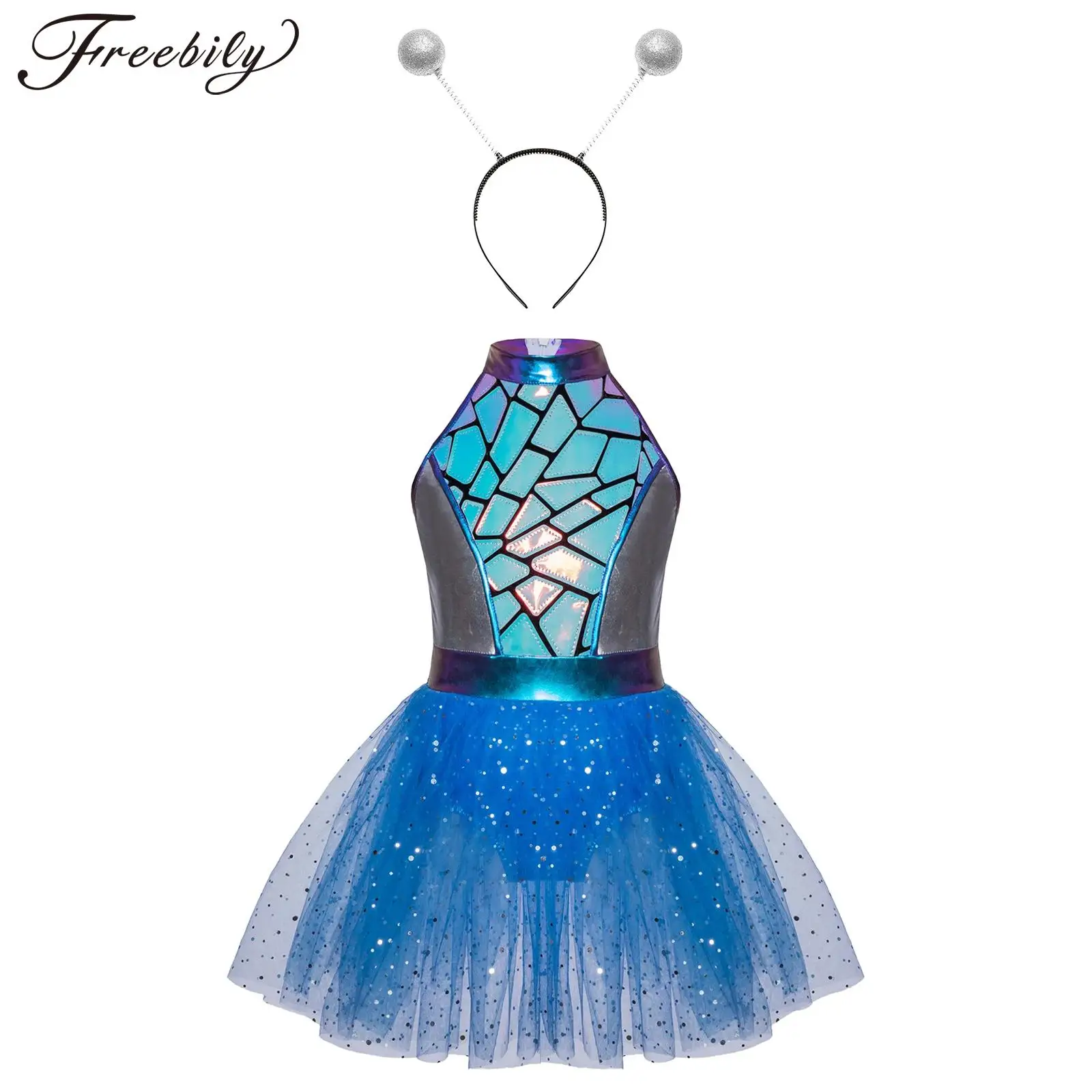 Dívčí halloween cizinec cosplais kostým metalické lesklý flitr pletivo tutu trikot šaty s vlasy obruč mezera robot sociální role divadelní hra obleček