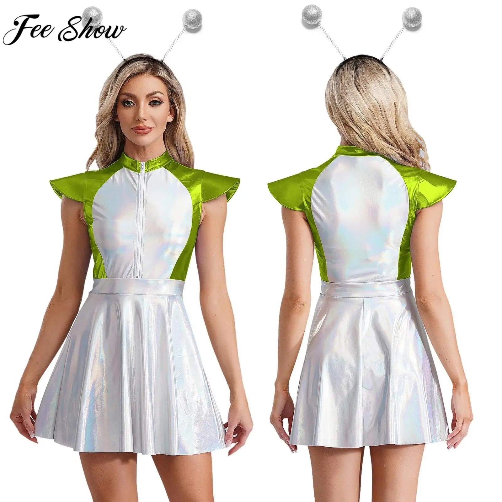 Ženy vnější mezera cutie cizinec cosplais kostým metalické lesklý šaty s vlasy obruč sada halloween bázeň večírek karneval oblečení