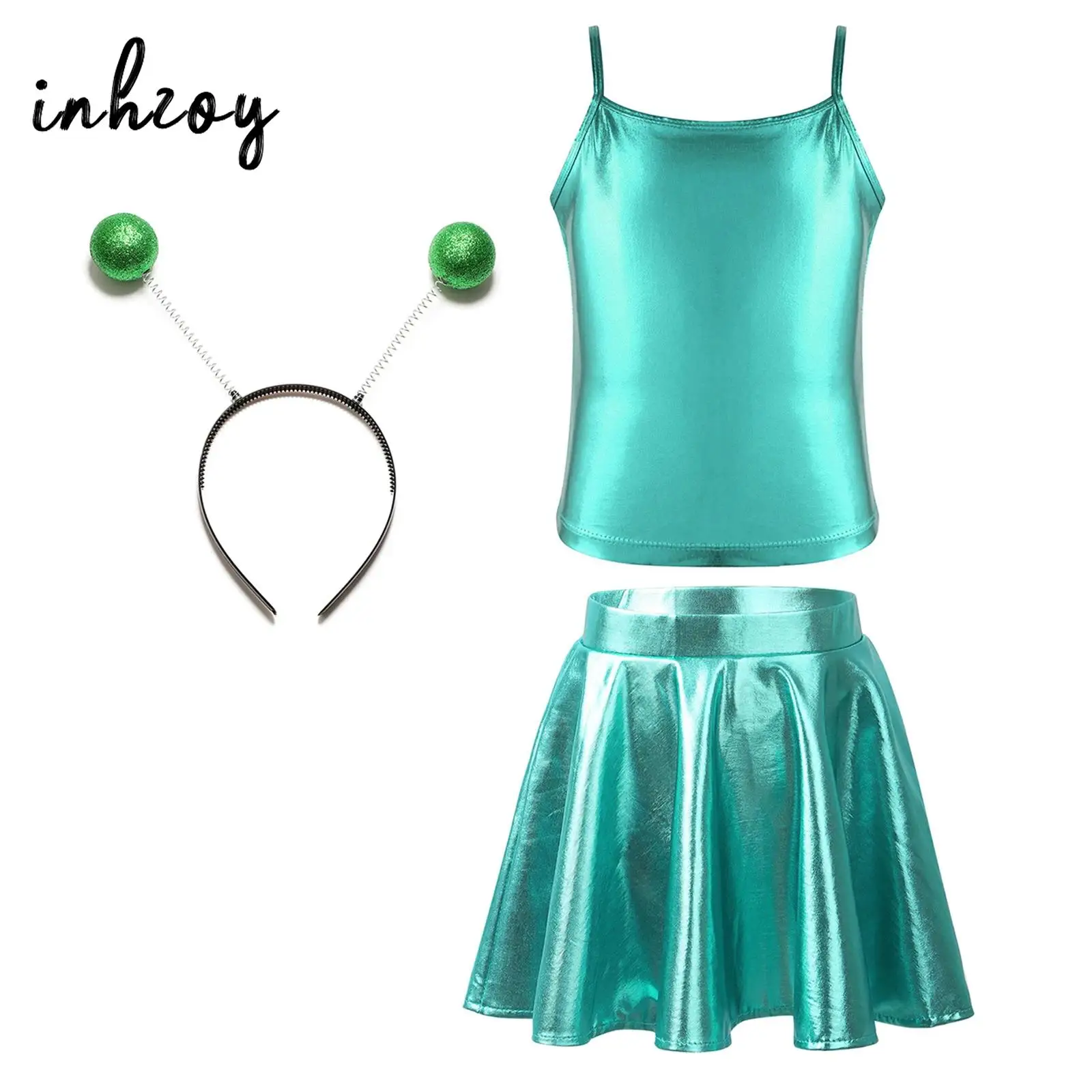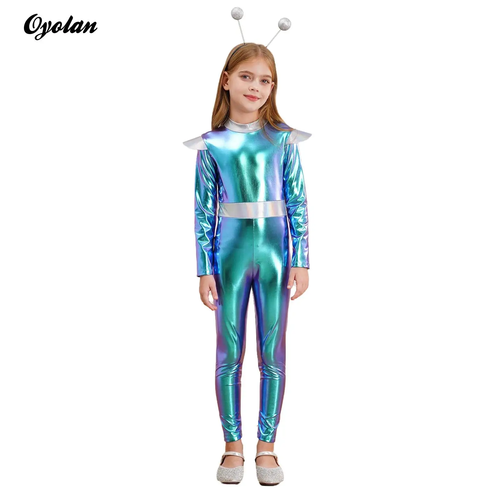 Děti dívčí halloween vnější mezera cutie cizinec cosplais kostým čepice rukáv metalické lesklý šaty s vlasy obruč pro škola ukázat