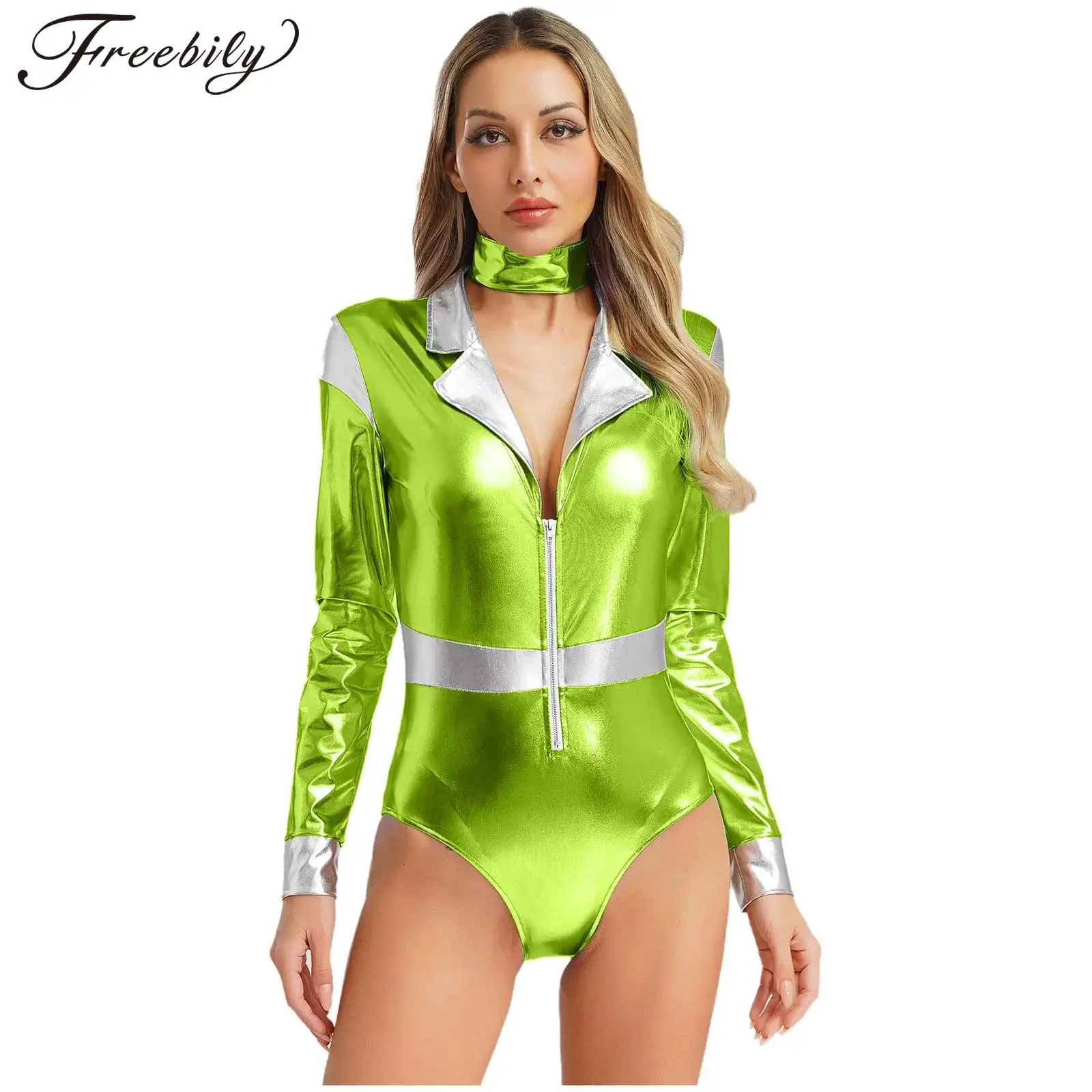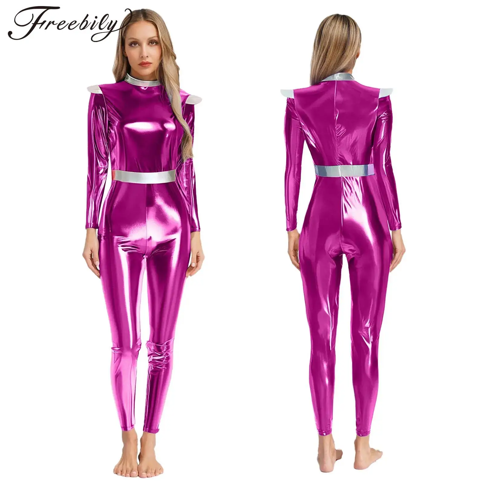 Ženy mezera cizinec robot galaxy bojovnice kosmonaut cosplais kostým dlouhé rukáv metalické lesklý kombinéza pro halloween bázeň večírek