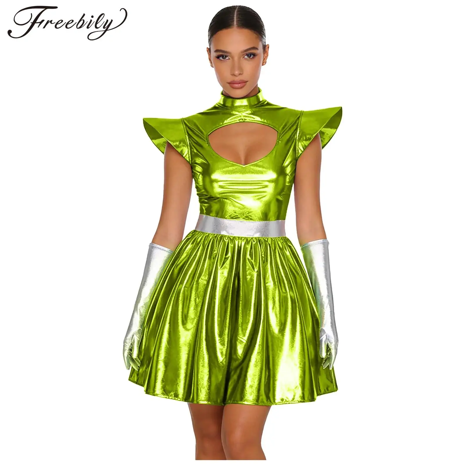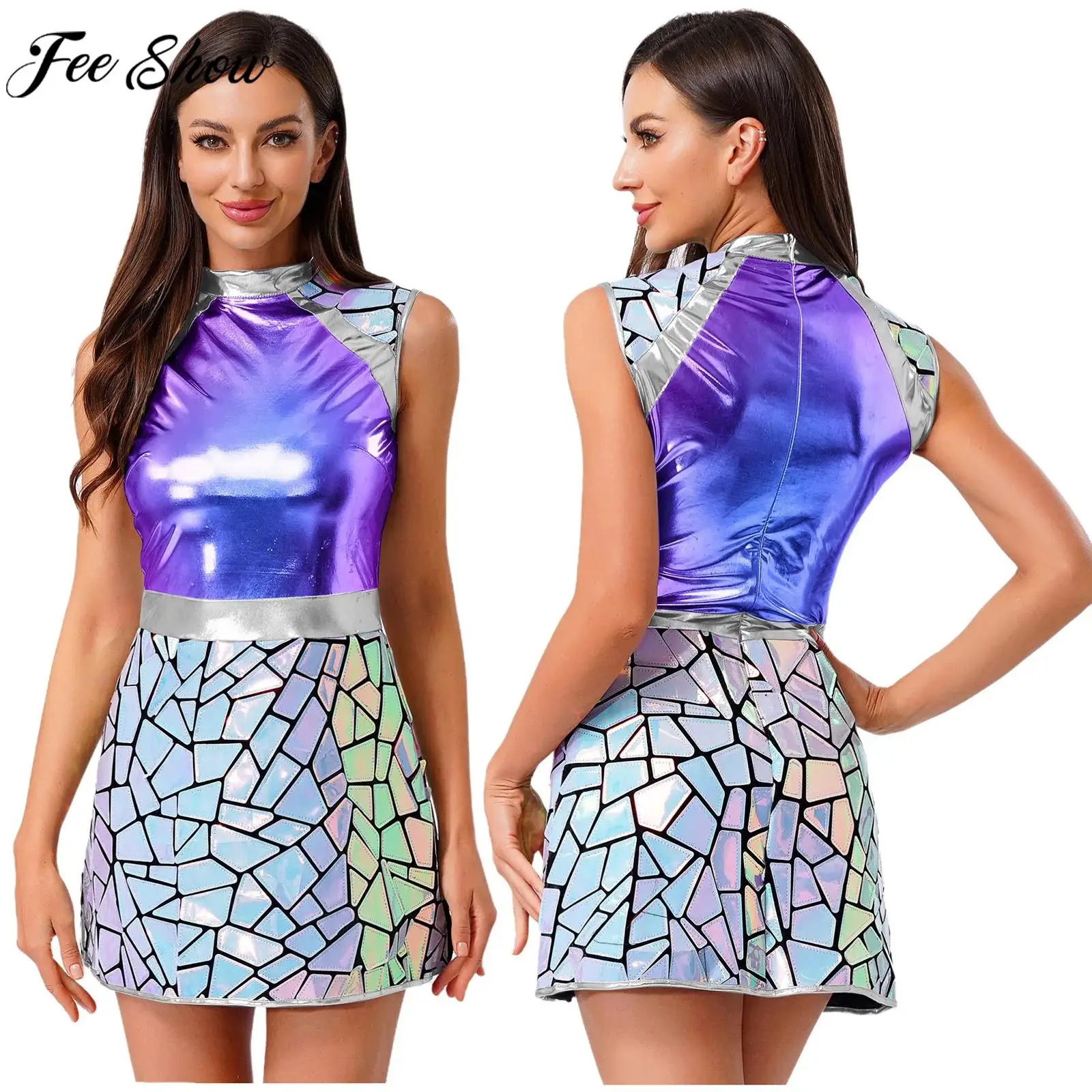 Dospělý ženy halloween cosplais kostým cizinec kosmonaut šaty nahoře šaty dlouhé rukáv metalické lesklý mezera ženské bojovnice šaty