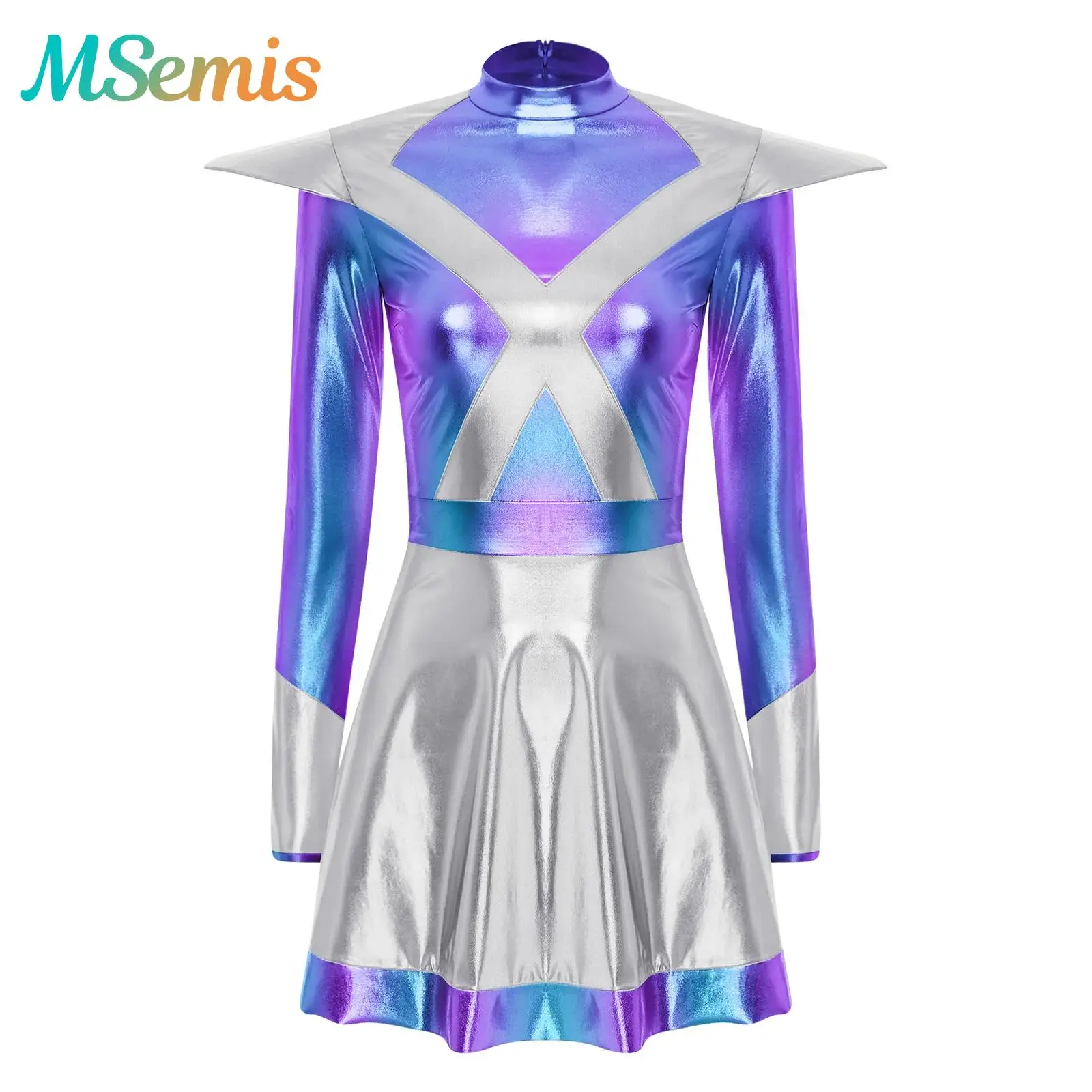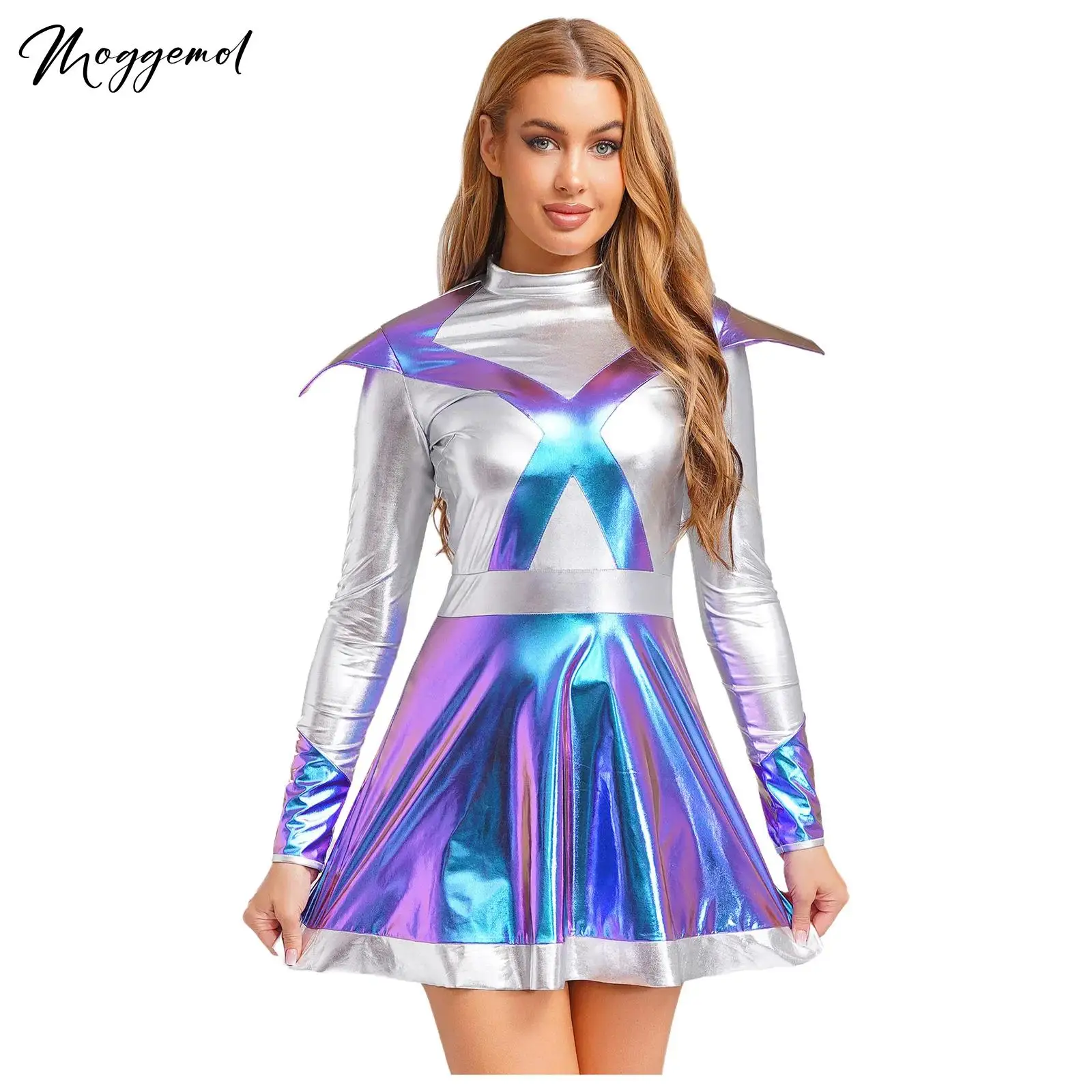 Ženy cizinec kosmonaut cosplais šaty dlouhé rukáv metalické lesklý mezera ženské bojovnice šaty halloween karneval roleplay obleček