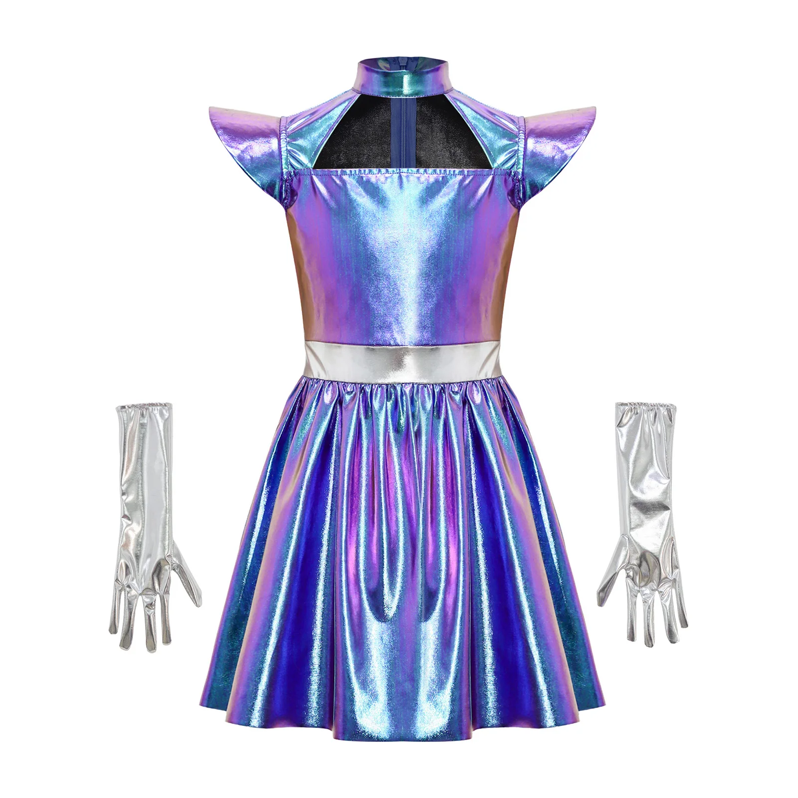 Děti dívčí cizinec cosplais kostým mezera robot kosmonaut galaxy bojovnice sociální role divadelní hra oblečení metalické lesklý na zip šaty s rukavice