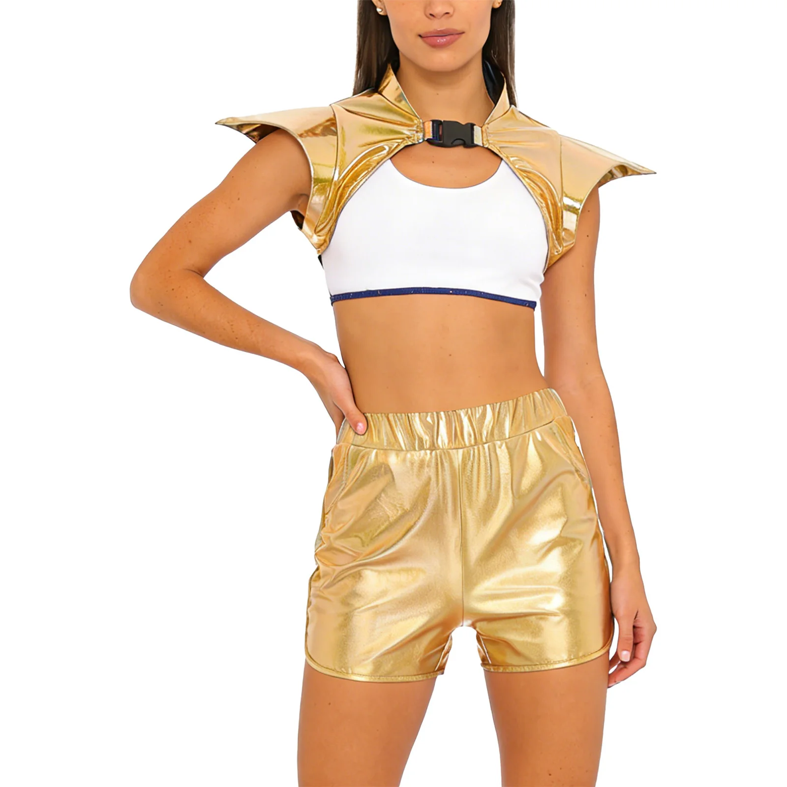 Ženy metalické cizinec bojovnice cosplais kostým collared pauldron gotický brnění a kapes booty šortky pro raves večírek halloween