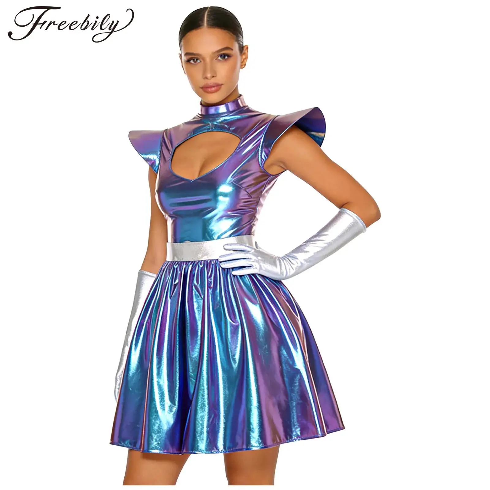 Ženy halloween bázeň večírek cizinec kosmonaut robot galaxy bojovnice cosplais kostým metalické lesklý vnější mezera šaty s rukavice
