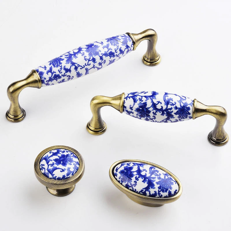 2ks móda kreativní modrá keramika nábytek bronz šuplík skříň dřít antický mosaz bílá modrá porcelán kredenc madla