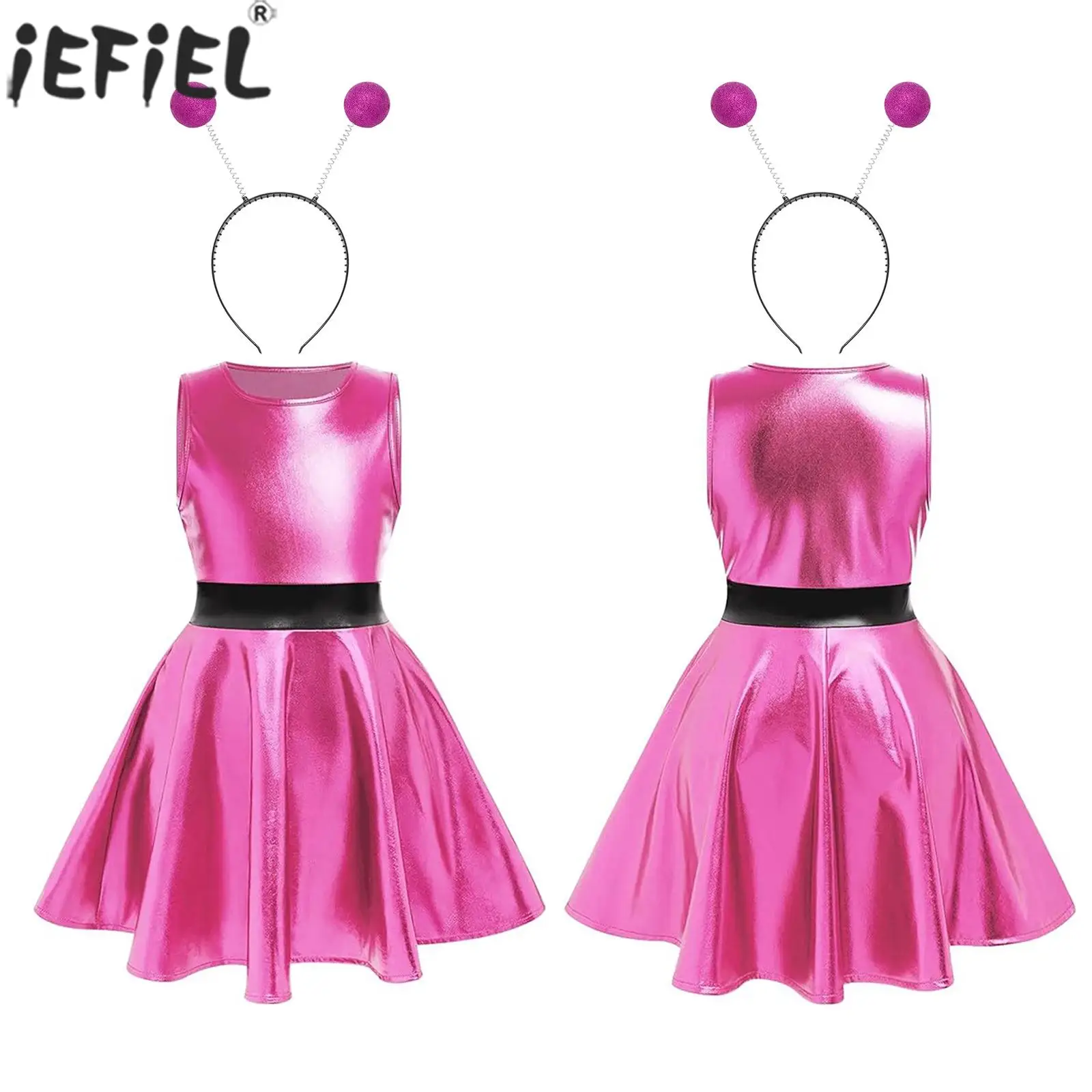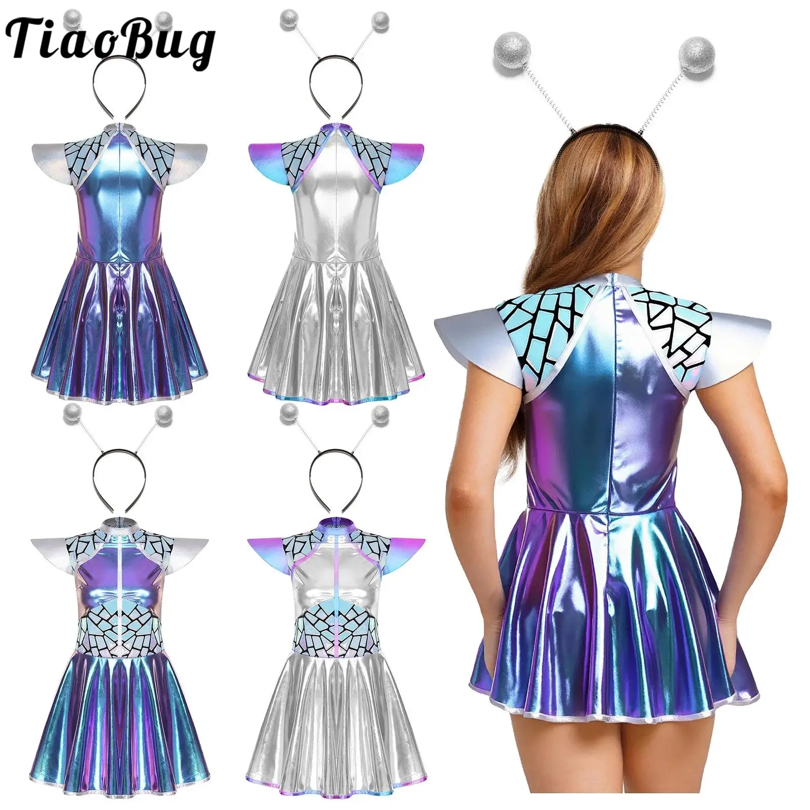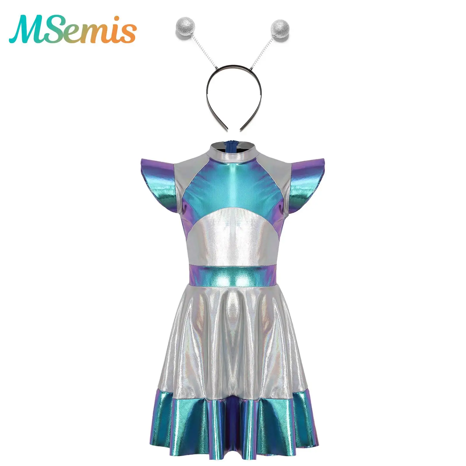 Děti dívčí cutie mezera cizinec cosplais šaty bez rukávů na zip metalické lesklý šaty vlasy obruč halloween kosmonaut robot kostým