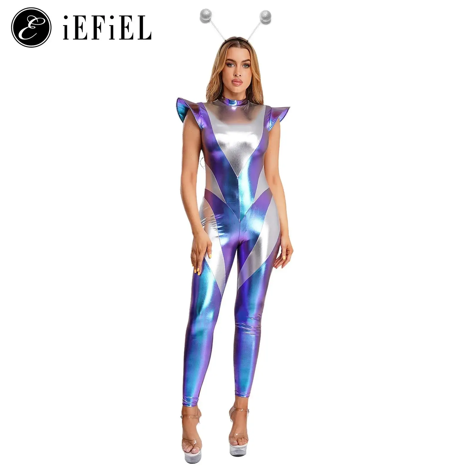 Ženy halloween cizinec kosmonaut cosplais unitard s vlasy obruč metalické lesklý robot outerspace kombinéza kombinéza bájit šaty nahoře