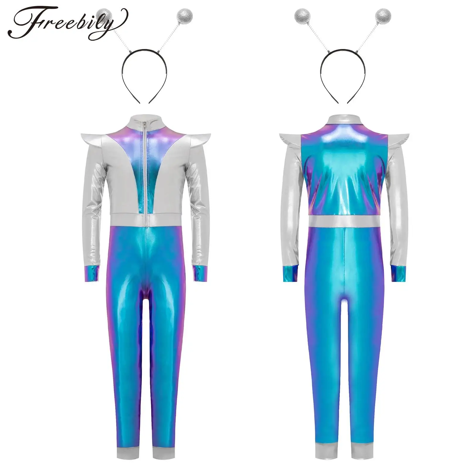 Děti halloween cizinec robot extra-terrestrial cosplais kostým dlouhé rukáv lesklý metalické vnější mezera kombinéza s vlasy obruč