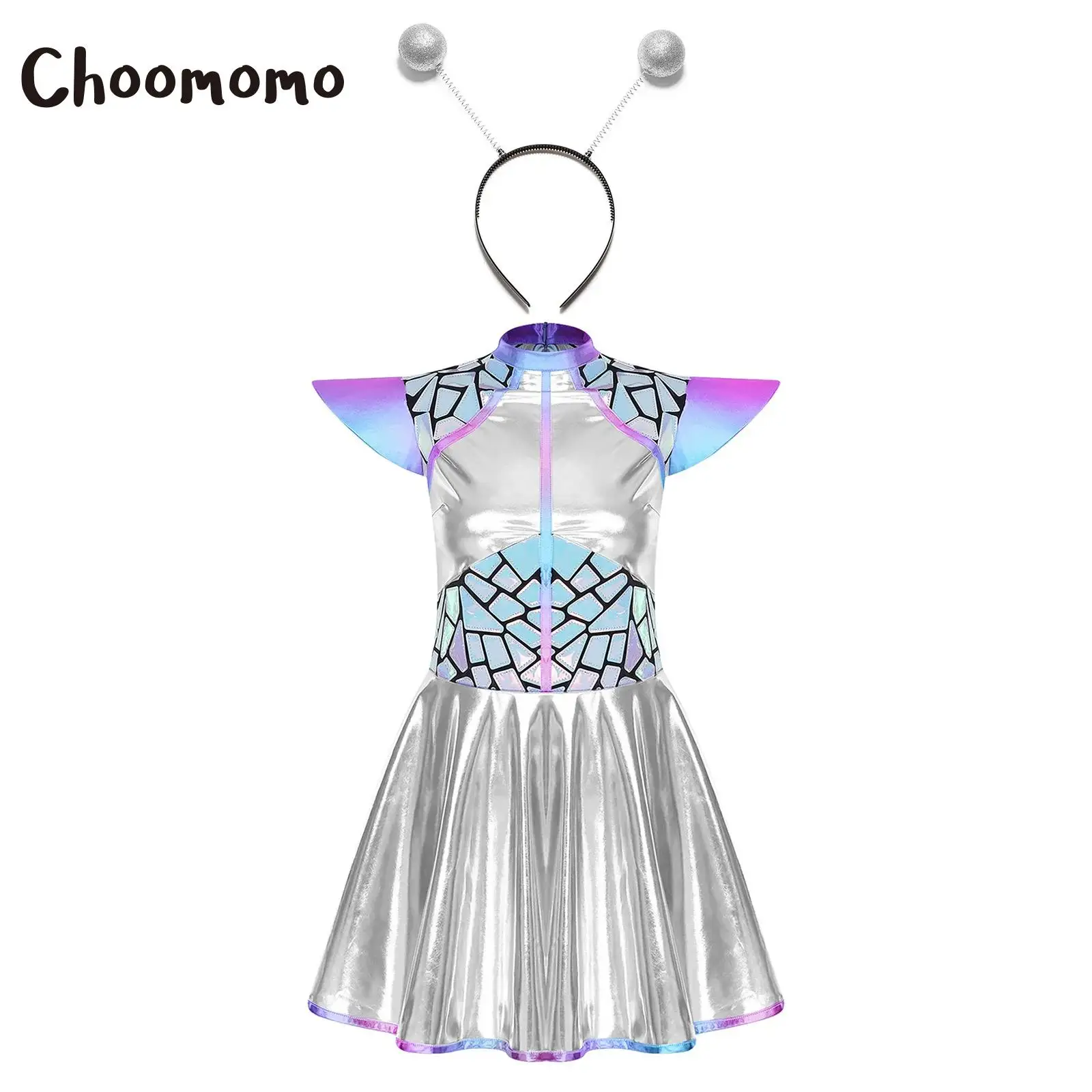 Děti dívčí halloween vnější mezera cutie cizinec cosplais kostým čepice rukáv metalické lesklý šaty s vlasy obruč pro škola ukázat