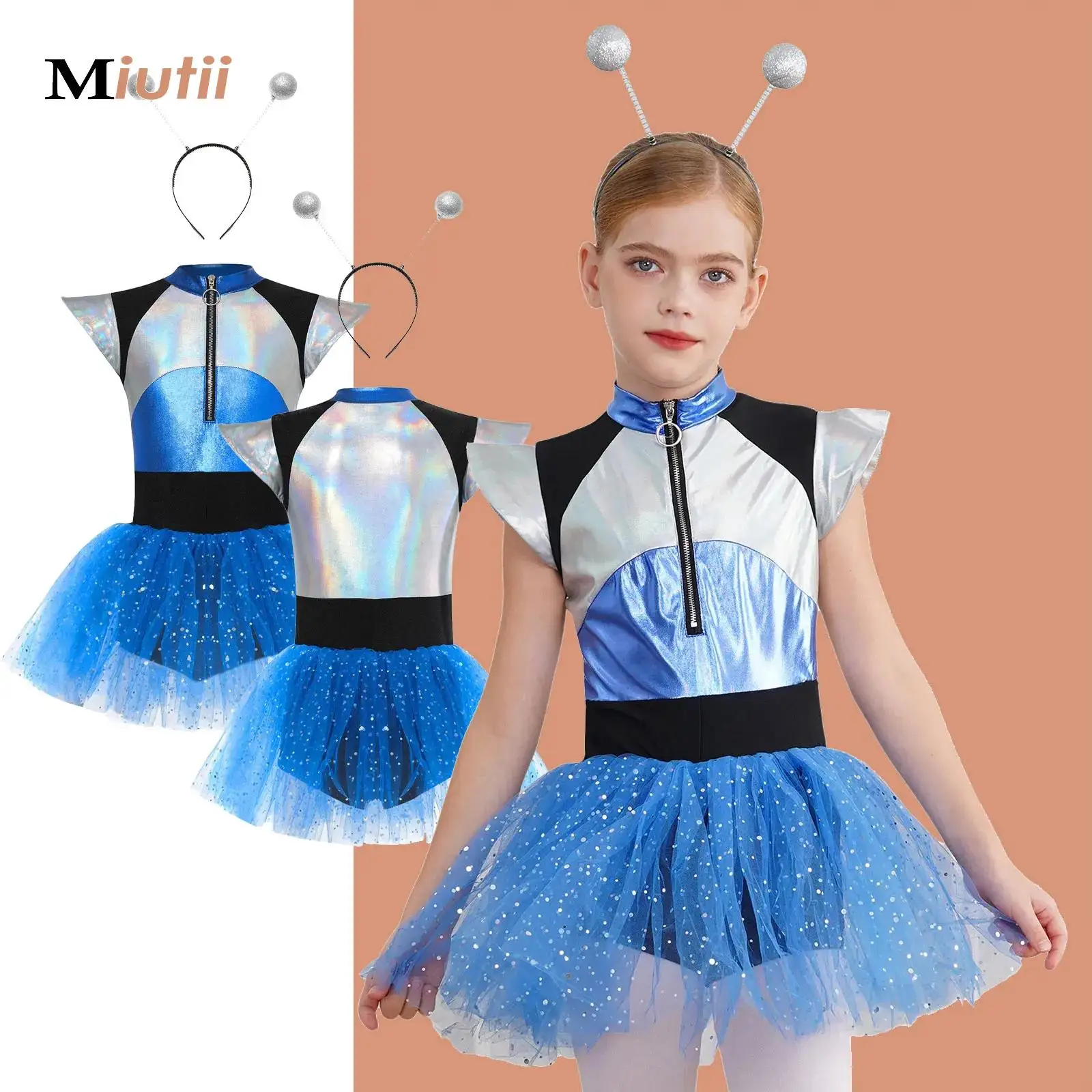 Dívčí halloween cizinec kosmonaut cosplais kostým létat rukáv lesklý metalické večírek tutu šaty s ruka sleevee vlasy obruč sada