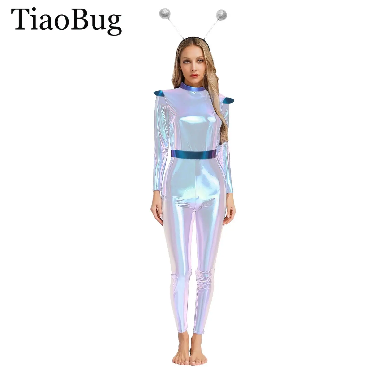 Ženy cizinec kosmonaut sociální role divadelní hra kombinéza lesklý vysoký krájet moderní kočičí oblek s ruka rukávy a vlasy obruč čelenka sada