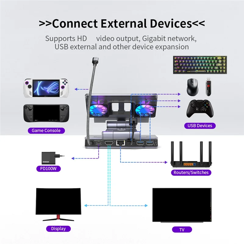 B04c-docking nádraží 6-in-1 fanoušek podpora pro pára deck/rog spojit se x/legion go/msi dráp s nastavitelný stánek 4K levý bok lodi