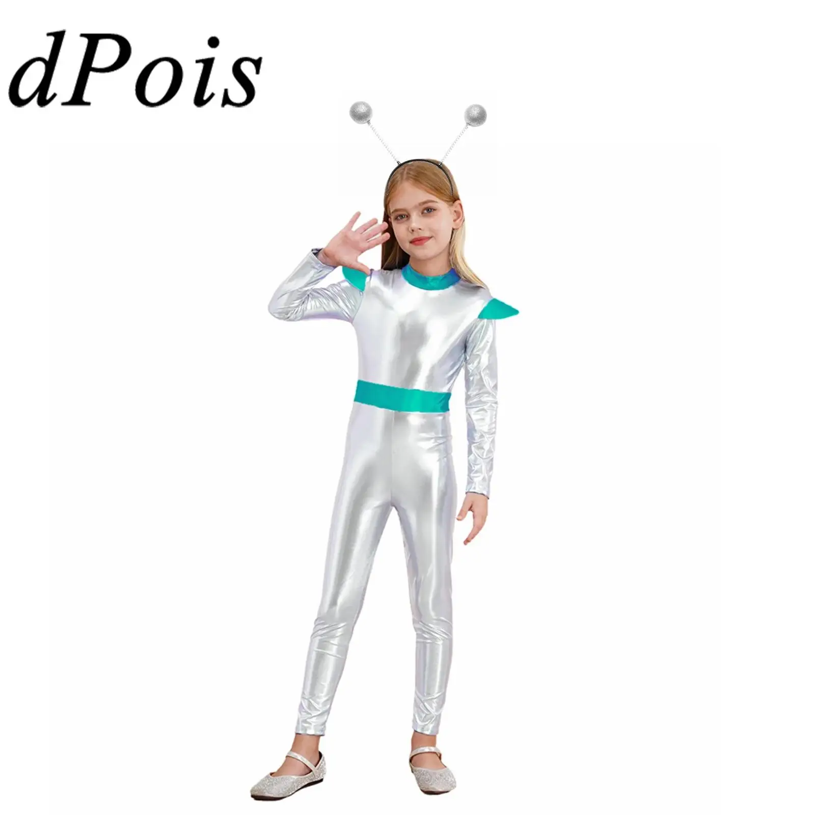 Chlapci dívčí cizinec cosplais robot spacemen kosmonaut kostým holografická dlouhé rukáv plný délka kombinéza s vlasy obruč sada 2ks