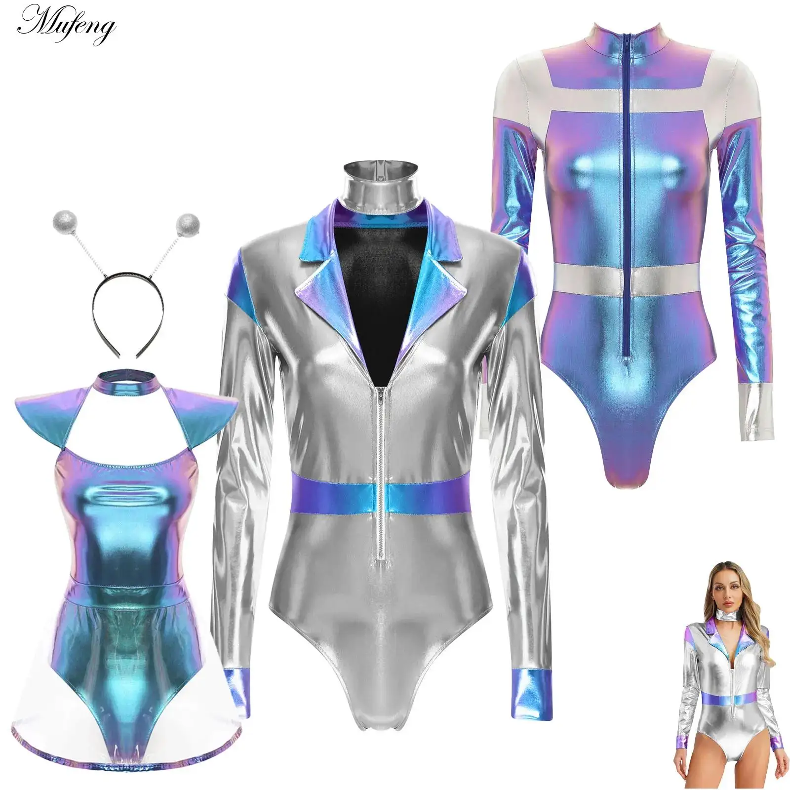 Ženy metalické lesklý mezera cizinec cosplais šaty s vlasy smyčka rukavice halloween kosmonaut robot galaxy bojovnice sociální role divadelní hra kostým